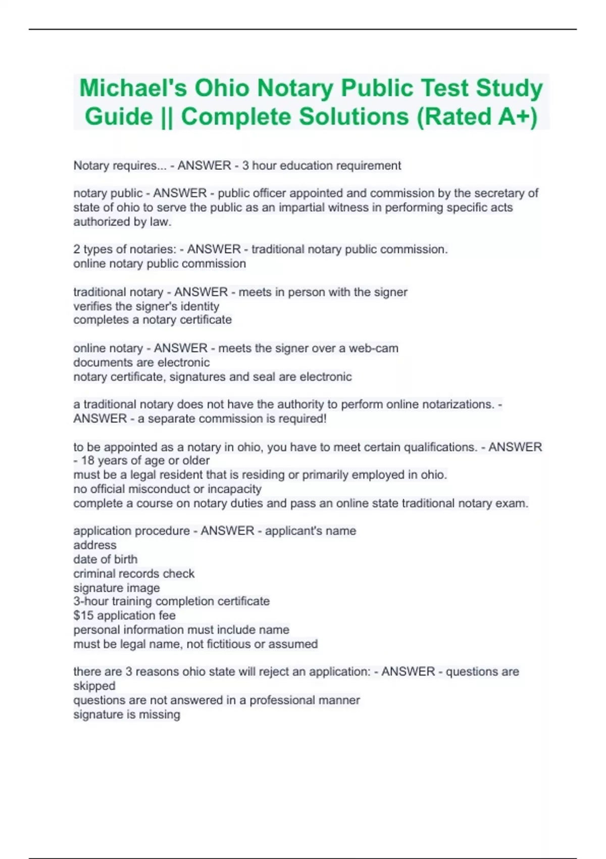Michael's Ohio Notary Public Test Study Guide || Complete Solutions (Rated A+) Michael's Ohio Notary Public Test Study Guide || Complete Solutions (Rated A+) Notary requires... - ANSWER - 3 hour education requirement notary public - ANSWER - public officer appointed and commission by the secretary of state of ohio to serve the public as an impartial witness in performing specific acts authorized by law. 2 types of notaries: - ANSWER - traditional notary public commission. online notary public commission traditional notary - ANSWER - meets in person with the signer verifies the signer's identity completes a notary certificate online notary - ANSWER - meets the signer over a web-cam documents are electronic notary certificate, signatures and seal are electronic a traditional notary does not have the authority to perform online notarizations. - ANSWER - a separate commission is required! to be appointed as a notary in ohio, you have to meet certain qualifications. - ANSWER - 18 years of age or older must be a legal resident that is residing or primarily employed in ohio. no official misconduct or incapacity complete a course on notary duties and pass an online state traditional notary exam. application procedure - ANSWER - applicant's name address date of birth criminal records check signature image 3-hour training completion certificate $15 application fee personal information must include name must be legal name, not fictitious or assumed there are 3 reasons ohio state will reject an application: - ANSWER - questions are skipped questions are not answered in a professional manner signature is missing what your commission allows and what's expected. once commission received: - ANSWER - you will serve a 5 year term you have statewide jurisdiction you can perform notarial acts anywhere in ohio