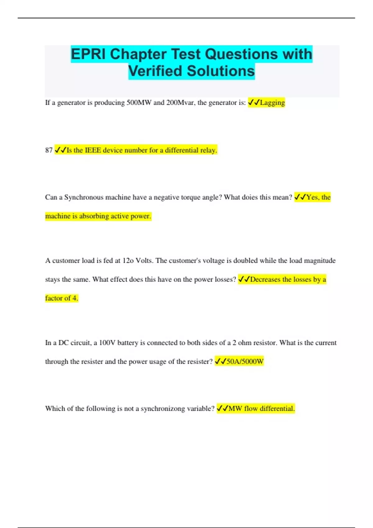 EPRI Chapter Test Questions with Verified Solutions If a generator is producing 500MW and 200Mvar, the generator is: Lagging 87 Is the IEEE device number for a differential relay. Can a Synchronous machine have a negative torque angle? What doies this mean? Yes, the machine is absorbing active power. A customer load is fed at 12o Volts. The customer's voltage is doubled while the load magnitude stays the same. What effect does this have on the power losses? Decreases the losses by a factor of 4. In a DC circuit, a 100V battery is connected to both sides of a 2 ohm resistor. What is the current through the resister and the power usage of the resister? 50A/5000W Which of the following is not a synchronizong variable? MW flow differential. In a typical multi-stage steam turbine, the governor control valves control steam entry into the: High pressure turbine The high side of a delta-wye connected transformer is connected to a power system with 199KV L-G high side voltage. What is the voltage across the winding of the delta transformer? 345KV Thermal limits are the direct result of? The thermal capability of system equipment. Reactive power flow is influenced more by system power and torque angles than reactive power. True or False False At what line power angle does the MW transfer across a transmission path equal 1/2 of the path's Pmax? 30 degrees A transmission line is rated at 1000MVA. The power flow on the line is 0MW and 1001Mvar. Is the transmission line overloaded? Yes The TTC limit has been determined to be 1000MW from east to west for a particular transmission path. The transmission path operator sells 500MW of its TTC. What is the path's ATC? 500MW A distribution line is rated for 50MVA. The line's power flow is currently 50MW and -50Mvar. The line is overloaded. True or Flase True Angle instability is the result of: High torque and power angles. If the resistance is ignored, the maximum theoretical MW flow across a transmission line will occur at a power angle of: 90 degrees. If the resistance is ignored, the maximum theoretical Mvar flow across a line will occur at a power angle of: 180 degrees 200MW is schediuled to flow from bus X to bus Y. Transmission line A-B has a distribution factor of 10% for this schedule. How many MW will flow on transmission line A-B? 20MW According to the load/frequency relationship, a 1% change in frequency will lead to what approximate magnitude of load change in a typical 10000MW system? 200MW A governor with a 0% droop is called: An isochronous governor Steam turbine generators typically have better governor response than hydroelectric generating units. True or False False A balancing authority's frequency bias is equal to: The balancing authority's frequency response characteristic (FRC), the natural response of the BA, The AGC system's bias value. All of the following are modes of AGC except: flat tie-line control, isochronous control, flat-frequency control, tie-line bias control Isochronous control In which stage of a generators response to a system disturbance is the power flow supported primarily by the generators excitation field Electromagnetic energy state. If system frequency were to run at 60.02Hz for two consecutive hours, how much positive time error would occur? 2.4s A Balance authority has a bias of -150MW. Frequency falls 0.05Hz due to an external disturbance. How many MW would you expect this BA to provide to the disturbance? +75MW An isochronous governor has a droop setting of: 0% What element of the power system is typically most susceptible to damage frolm prolonged operation at frequencies above or below 60Hz? Low pressure turbine stage blades. Hydro electric generators typically exhibit better governor response than thermal generators because: Hydro-electric generators typically have more stored energy. A generator with a 6% droop governor is connected to a 60HZ power system. Initially, the generator is 100% load. Frequency then falls 0.9HZ. What is the generator's new % output? 100% What magnitude of frequency change would cause a 10% droop governor to move its generator from zero to full output in a 60Hz system? 6HZ Which component of the CPS is intended to limit the magnitude of unscheduled power flows? CPS2 What is the upper limit to the CPS1 Magnitude? No limit What is the Mvar production of a 50Mvar shunt capacitor that is energized at 90% of it'snominal voltage? 40.5Mvar A 5% change in voltage will typically lead to what change in the total load magnitude? 3% A tranformer can be over-excited it exposed to which of the following? High voltage, Low frequency, high voltage and low frequency, or all of the above All of the Above What is the approximate Mvar/mile production for a 345KV overhead line? 3/4 A 345KV transmission line operates at various voltage levels throughout the day. At which voltage level does the transmission line produce more Mvar? 345KV, 340KV, 350KV, 360KV 360KV. Mvar production is a function of voltage. A transmission line has 50 ohms of inductive reactance. 25 ohms of series capacitors are inserted in the line. What is the line's % compensation? 50% The MW loading at which the Mvar from the line's natural capacitance is equal to the Mvar that the line needs to support its voltage. Surge Impoedance Loading (SIL) What is the approximate Mvar/mile production for a 500KV overhead line? 2.0 Given a purely inductive load, what can be said about the MVA this load draws from the power system? The load draws only Mvars A generator with spare Mvar is Always a source of dynamic reactive reserve. True or False False The nominal load is: Equal to the rated load A period of voltage instability always results in a voltage collapse. True or False False The critical voltage and critical MW transfer are located at the: knee of the P-V curve During voltage instability prone conditions, tap changing to support secondary voltage should generally NOT be used if the secondary load is formed by Non-motor load PV curves indi