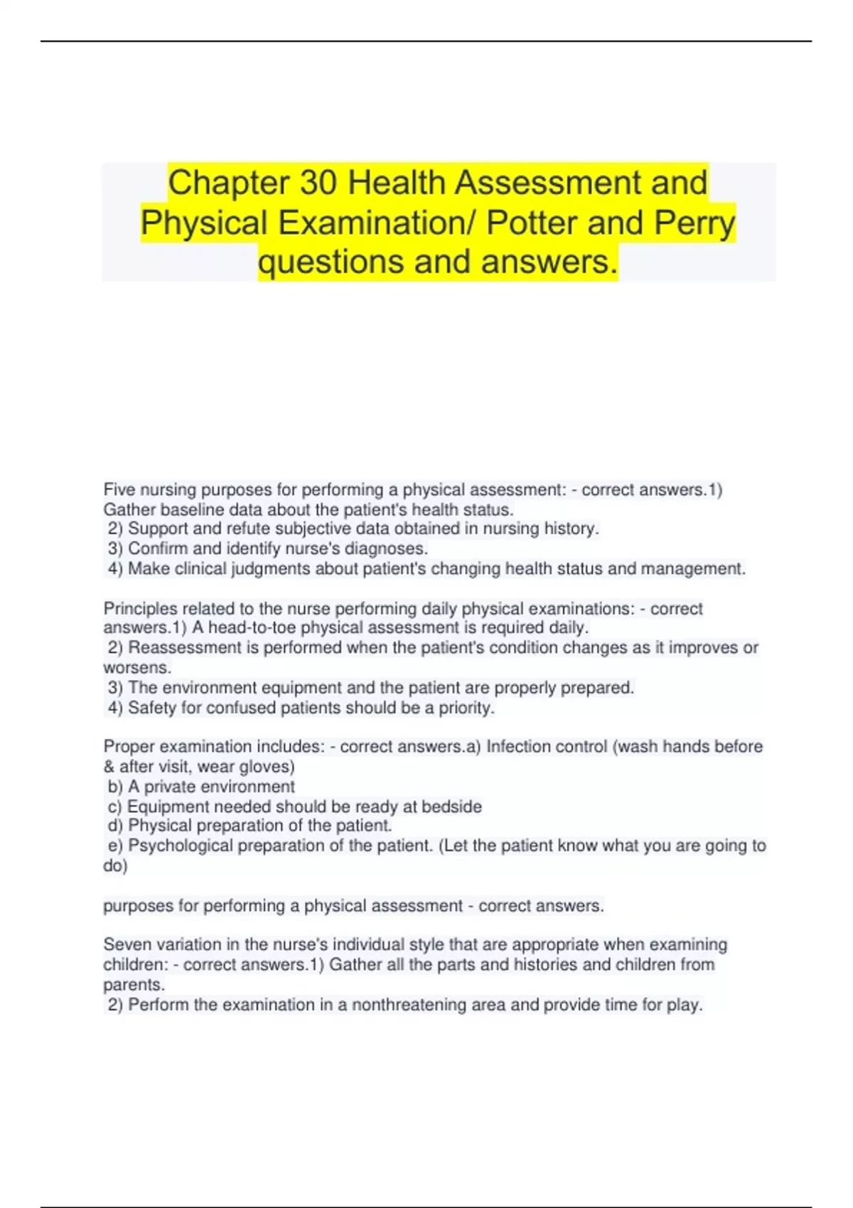 Chapter 30 Health Assessment and Physical Examination/ Potter and Perry questions and answers. Five nursing purposes for performing a physical assessment: - correct answers.1) Gather baseline data about the patient's health status. 2) Support and refute subjective data obtained in nursing history. 3) Confirm and identify nurse's diagnoses. 4) Make clinical judgments about patient's changing health status and management. Principles related to the nurse performing daily physical examinations: - correct answers.1) A head-to-toe physical assessment is required daily. 2) Reassessment is performed when the patient's condition changes as it improves or worsens. 3) The environment equipment and the patient are properly prepared. 4) Safety for confused patients should be a priority. Proper examination includes: - correct answers.a) Infection control (wash hands before & after visit, wear gloves) b) A private environment c) Equipment needed should be ready at bedside d) Physical preparation of the patient. e) Psychological preparation of the patient. (Let the patient know what you are going to do) purposes for performing a physical assessment - correct answers. Seven variation in the nurse's individual style that are appropriate when examining children: - correct answers.1) Gather all the parts and histories and children from parents. 2) Perform the examination in a nonthreatening area and provide time for play. 3) Offer support to the parents during the examination and do not pass judgment. 4) Call children by their first names and address their parents as Mr. and Mrs. 5) Use open-end questions to allow parents to share more information. 6) Treat adolescents as adults. 7) Provide confidentiality for adolescents; speak to them alone. Seven variations in the nurse's individual style that are appropriate when examining and older adult. - correct answers.1) Do not stereotype the aging patients' level of cognition. 2) Be sensitive to sensory or physical limitations, (more time). 3) Adequate space is needed. 4) Use patience, allow for pauses, and observe for details. 5) Certain types of information may be stressful to give. 6) Perform examination near bathroom facilities. 7) Be alert for signs of increasing fatigue. Principles to follow to keep an examination well organized: - correct answers.1) Compare both sides for symmetry 2) If the patient is ill, first assess the systems of the body part that is most at risk. 3) Offer rest periods if the patient becomes fatigued. 4) Record assessments in specific terms in the record. 5) Use common and accepted medical terms and abbreviations. 6) Record quick notes during examination to avoid delays. Inspection: - correct answers.Is looking, listening and smelling to distinguish normal form abnormal findings. Guidelines to achieve the best results during inspection: - correct answers.a) Adequate lighting is available. b) Use a direct light source. c) Inspect each area for size, shape, and color. d) Position and expose body parts as needed, maintaining privacy. e) Validate findings with the patient. Palpation: - correct answers.Involves using hands to touch body parts. light palpation - correct ves pressing inward 1 cm (superficial) Deep palpation - correct ves depressing the area 4 cm to assess the condition of organs. Auscultation - correct listening to the internal sounds the body makes. Auscultation described as - correct answers.a) Frequency indicates the number of sound waves cycles generated per second by a vibrating object. b) Amplitude describes the loudness, soft to loud. c) Quality describes sound of similar frequency and loudness. d) Duration describes length of time that sound vibrations last. Observations of the patient's general appearance and behavior that should be viewed - correct answers.a) Gender b) Age c) Signs of distress d) Body type e) Posture f) Gait g) Body Movements h) Hygiene and grooming i) Dress j) Body odor k) Affect and mood l) Speech possible abuse - correct answers.Physical injury or neglect, (evidence of malnutrition or presence of bruising). Also watch for fear of spouse or partner, caregiver, or parent. The following are related to the acronym CAGE - correct answers.C: Have you ever felt the need to cut down on your use? A: Have people annoyed you by criticizing you use? G: Have you ever felt bad or guilty about your use? E: Have you ever used or had a drink first thing in the morning as an "eye opener" to steady you nerves or feel normal? Three actions that should be taken to ensure accurate weight measurement of a hospitalized patient - correct answers.a) Weigh patients at the same time of day. b) Weigh patients at the same scale. c) Weigh patients in the same clothes. Assessment of skin reveals the patient's health status: - correct answers.a) Oxygenation b) Circulation c) Nutrition d) Local tissue damage e) Hydration Risk for skin lesions in hospitalized patients: - correct answers.a) Exposure to pressure during immobilization. b) Various medications c) Neurological impairment d) Chronic illness e) Orthopedic injury f) Diminished mental status g) Poor tissue oxygenation h) Low cardiac output i) Inadequate nutrition Pigmentation - correct skin color. It is usually uniform over the body Physical findings of the skin that is indicative of substance abuse: - correct answers.Physical findings of the skin that is indicative of substance abuse: Indurated - correct hardened Turgor - correct skin elasticity Edema - correct areas of the skin that are swollen or edematous from a buildup of fluid in the tissues. Senile keratosis - correct a thickening of skin. Cherry angiomas - correct ruby-red papules. Three type of lice: - correct answers.a) Pediculus humanus capitis (head lice) b) Pediculus humanus corporis (body lice) c) Pediculus pubis (Crab lice) Clubbing - correct a change in the angle between the nail and nail base, including softening, flattening, and enlargement of fingertips. Beau lines - correct transverse depression in the 