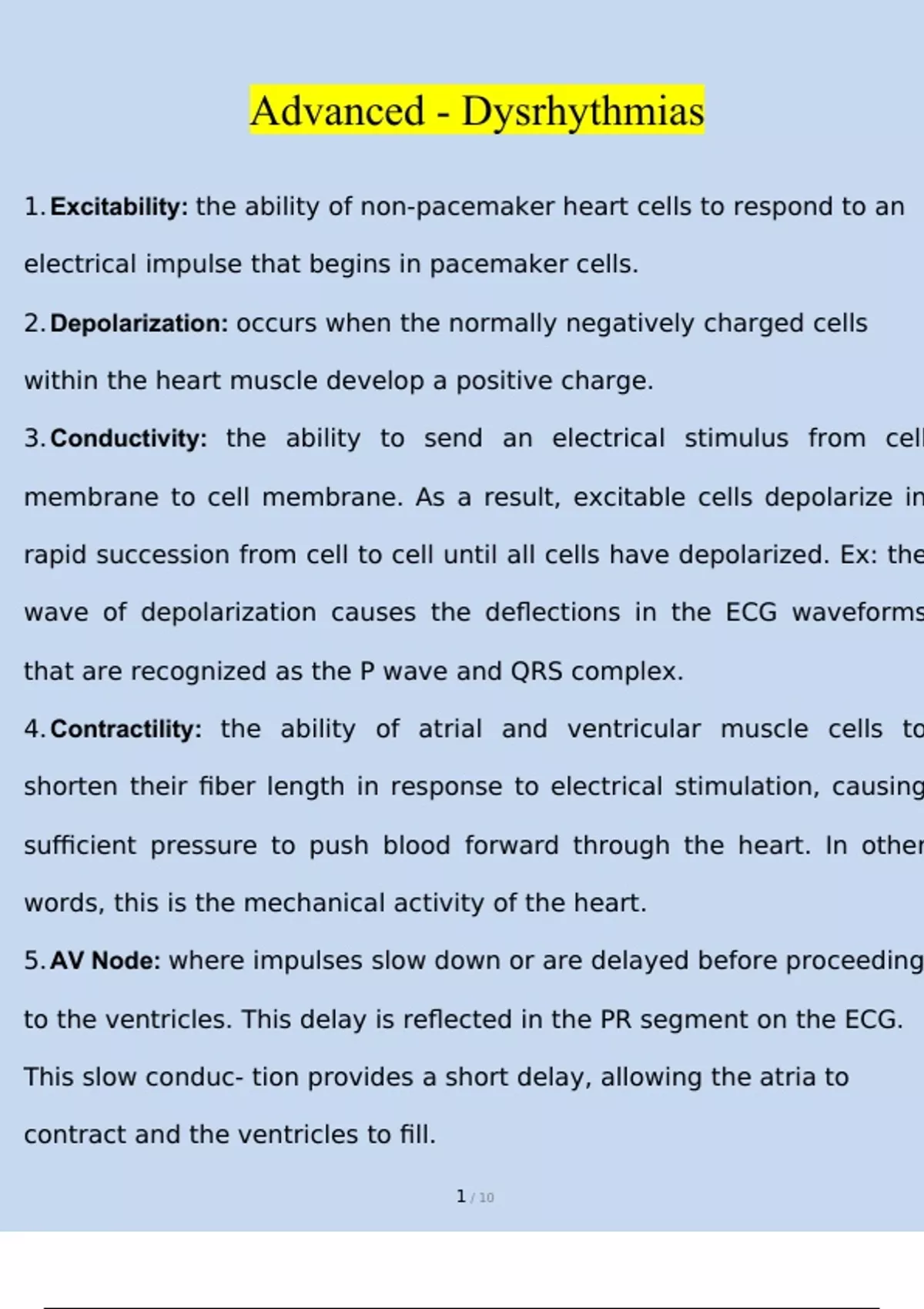 Excitability - Answer- the ability of non-pacemaker heart cells to respond to an electrical impulse that begins in pacemaker cells. Depolarization - Answer- occurs when the normally negatively charged cells within the heart muscle develop a positive charge. Conductivity - Answer- the ability to send an electrical stimulus from cell membrane to cell membrane. As a result, excitable cells depolarize in rapid succession from cell to cell until all cells have depolarized. Ex: the wave of depolarization causes the deflections in the ECG waveforms that are recognized as the P wave and QRS complex. Contractility - Answer- the ability of atrial and ventricular muscle cells to shorten their fiber length in response to electrical stimulation, causing sufficient pressure to push blood forward through the heart. In other words, this is the mechanical activity of the heart. AV Node - Answer- where impulses slow down or are delayed before proceeding to the ventricles. This delay is reflected in the PR segment on the ECG. This slow conduction provides a short delay, allowing the atria to contract and the ventricles to fill. SA Node - Answer- the heart's primary pacemaker. It can spontaneously and rhythmically generate electrical impulses at a rate of 60-100 beats per min and therefore has the greatest degree of automaticity. Purkinje Cells - Answer- composed of the bundle of HIS, bundle branches, and these fibers. Responsible for the rapid conduction of electrical impulses throughout the ventricles, leading to ventricular depolarization and the subsequent ventricular muscle contraction. Semi-Reclined - Answer- While obtaining a 12-lead ECG, remind the patient be as as still as possible in a ________________________ position, breathing normally. Clea, Dry, Moist - Answer- For continous ECG monitoring, be sure to __________________ skin and clip hairs/shave. Ensure that the electrode placement is _____________ and the gel on each electrode is ______________ and fresh. P Wave - Answer- a deflection on an ECG representing atrial depolarization. When the electrical impulse is consistently generated form the SA node, this wave has a consistent shape in a given lead. If an impulse is then generated from a different (ectopic) focus, such as atrial tissue, the shape of this wave changes in the lead, ind