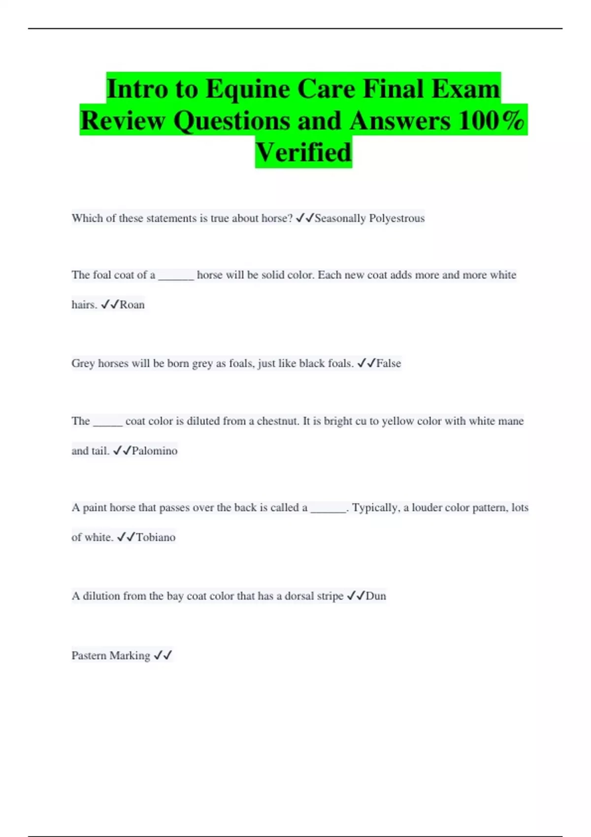 Intro to Equine Care Final Exam Review Questions and Answers 100% Verified Which of these statements is true about horse? Seasonally Polyestrous The foal coat of a ______ horse will be solid color. Each new coat adds more and more white hairs. Roan Grey horses will be born grey as foals, just like black foals. False The _____ coat color is diluted from a chestnut. It is bright cu to yellow color with white mane and tail. Palomino A paint horse that passes over the back is called a ______. Typically, a louder color pattern, lots of white. Tobiano A dilution from the bay coat color that has a dorsal stripe Dun Pastern Marking