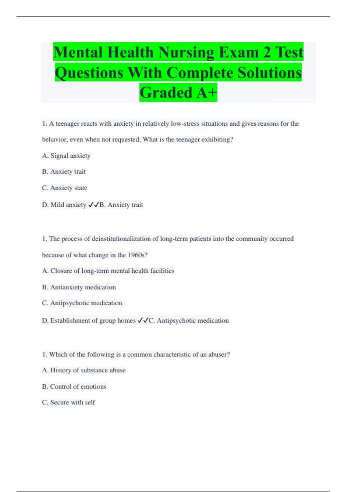 Mental Health Nursing Exam 2 Test Questions With Complete Solutions Graded A+ 1. A teenager reacts with anxiety in relatively low-stress situations and gives reasons for the behavior, even when not requested. What is the teenager exhibiting? A. Signal anxiety B. Anxiety trait C. Anxiety state D. Mild anxiety B. Anxiety trait 1. The process of deinstitutionalization of long-term patients into the community occurred because of what change in the 1960s? A. Closure of long-term mental health facilities B. Antianxiety medication C. Antipsychotic medication D. Establishment of group homes C. Antipsychotic medication 1. Which of the following is a common characteristic of an abuser? A. History of substance abuse B. Control of emotions C. Secure with self