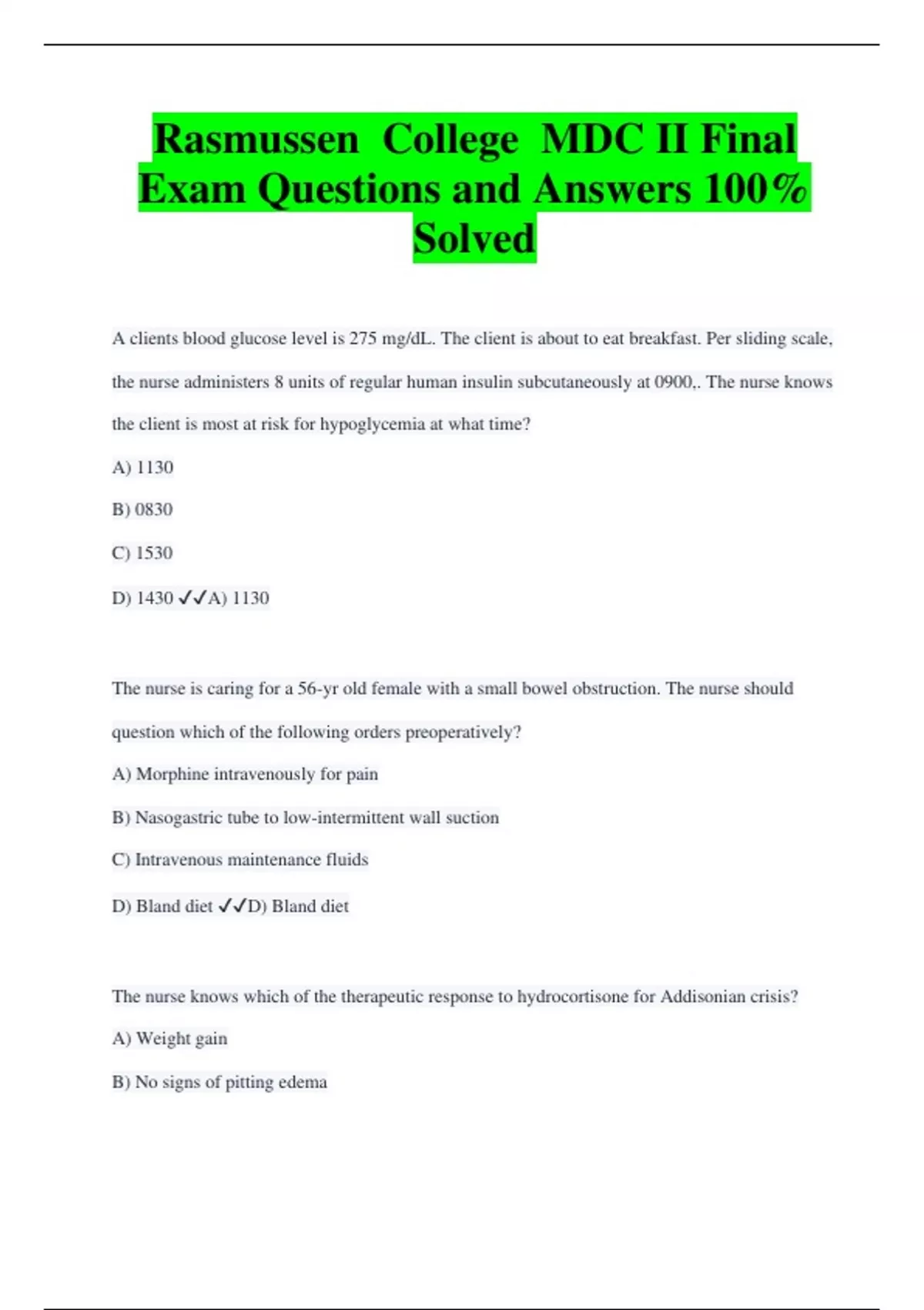 Rasmussen College MDC II Final Exam Questions and Answers 100% Solved A clients blood glucose level is 275 mg/dL. The client is about to eat breakfast. Per sliding scale, the nurse administers 8 units of regular human insulin subcutaneously at 0900,. The nurse knows the client is most at risk for hypoglycemia at what time? A) 1130 B) 0830 C) 1530 D) 1430 A) 1130 The nurse is caring for a 56-yr old female with a small bowel obstruction. The nurse should question which of the following orders preoperatively? A) Morphine intravenously for pain B) Nasogastric tube to low-intermittent wall suction C) Intravenous maintenance fluids D) Bland diet D) Bland diet The nurse knows which of the therapeutic response to hydrocortisone for Addisonian crisis? A) Weight gain B) No signs of pitting edema C) Increased urine output D) Client is alert and oriented with improved lethargy D) Client is alert and oriented with improved lethargy