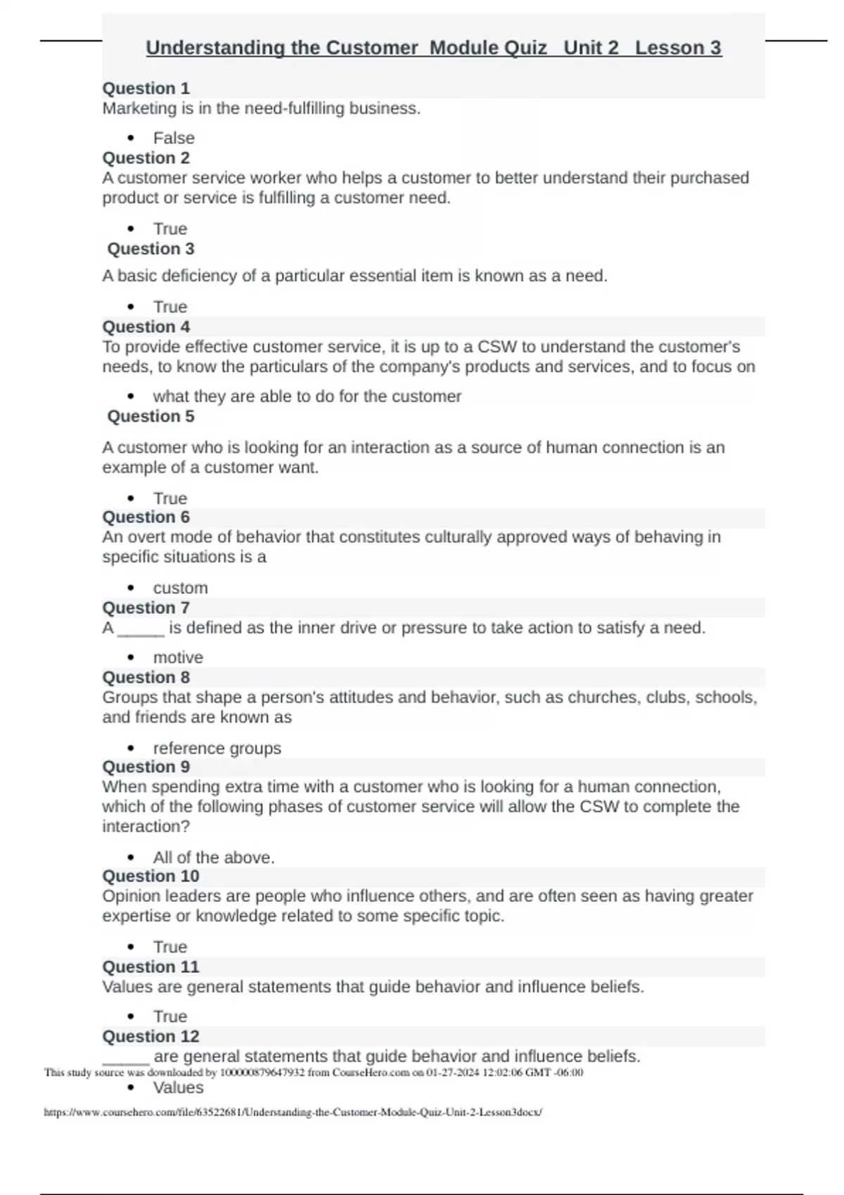 Understanding the Customer_Module Quiz_ Unit 2_ Lesson 3 Question 1 Marketing is in the need-fulfilling business. False Question 2 A customer service worker who helps a customer to better understand their purchased product or service is fulfilling a customer need. True Question 3 A basic deficien