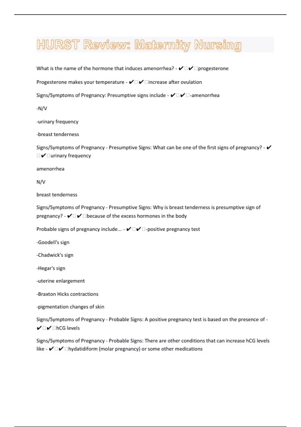 What is the name of the hormone that induces amenorrhea? - ️️progesterone Progesterone makes your temperature - ️️increase after ovulation Signs/Symptoms of Pregnancy: Presumptive signs include - ️️-amenorrhea -N/V -urinary frequency -breast tenderness Signs/Symptoms of Pregnancy - Presumptive Signs: What can be one of the first signs of pregnancy? - ️️urinary frequency amenorrhea N/V breast tenderness Signs/Symptoms of Pregnancy - Presumptive Signs: Why is breast tenderness is presumptive sign of pregnancy? - ️️because of the excess hormones in the body Probable signs of pregnancy include... - ️️-positive pregnancy test -Goodell's sign -Chadwick's sign -Hegar's sign -uterine enlargement -Braxton Hicks contractions -pigmentation changes of skin Signs/Symptoms of Pregnancy - Probable Signs: A positive pregnancy test is based on the presence of - ️️hCG levels Signs/Symptoms of Pregnancy - Probable Signs: There are other conditions that can increase hCG levels like - ️️hydatidiform (molar pregnancy) or some other medications
