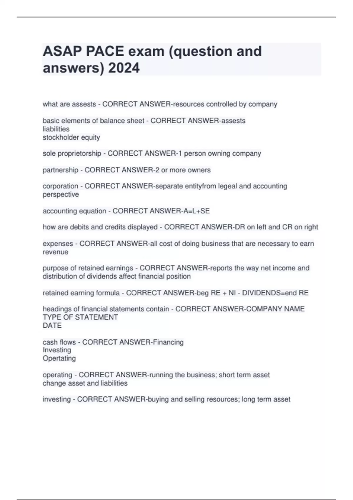 ASAP PACE exam (question and answers) 2024 what are assests - CORRECT ANSWER-resources controlled by company basic elements of balance sheet - CORRECT ANSWER-assests liabilities stockholder equity sole proprietorship - CORRECT ANSWER-1 person owning company partnership - CORRECT ANSWER-2 or more owners corporation - CORRECT ANSWER-separate entityfrom legeal and accounting perspective accounting equation - CORRECT ANSWER-A=L+SE how are debits and credits displayed - CORRECT ANSWER-DR on left and CR on right expenses - CORRECT ANSWER-all cost of doing business that are necessary to earn revenue purpose of retained earnings - CORRECT ANSWER-reports the way net income and distribution of dividends affect financial position retained earning formula - CORRECT ANSWER-beg RE + NI - DIVIDENDS=end RE headings of financial statements contain - CORRECT ANSWER-COMPANY NAME TYPE OF STATEMENT DATE cash flows - CORRECT ANSWER-Financing Investing Opertating operating - CORRECT ANSWER-running the business; short term asset change asset and liabilities investing - CORRECT ANSWER-buying and selling resources; long term asset financing - CORRECT ANSWER-borrowing from banks ; long term liability; stocks and bonds dividends - CORRECT ANSWER-distribut