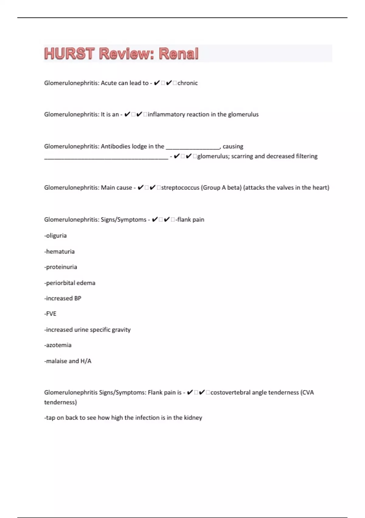 Glomerulonephritis: Acute can lead to - ️️chronic Glomerulonephritis: It is an - ️️inflammatory reaction in the glomerulus Glomerulonephritis: Antibodies lodge in the ________________, causing _____________________________________ - ️️glomerulus; scarring and decreased filtering Glomerulonephritis: Main cause - ️️streptococcus (Group A beta) (attacks the valves in the heart) Glomerulonephritis: Signs/Symptoms - ️️-flank pain -oliguria -hematuria -proteinuria -periorbital edema -increased BP -FVE -increased urine specific gravity -azotemia -malaise and H/A Glomerulonephritis Signs/Symptoms: Flank pain is - ️️costovertebral angle tenderness (CVA tenderness) -tap on back to see how high the infection is in the kidney