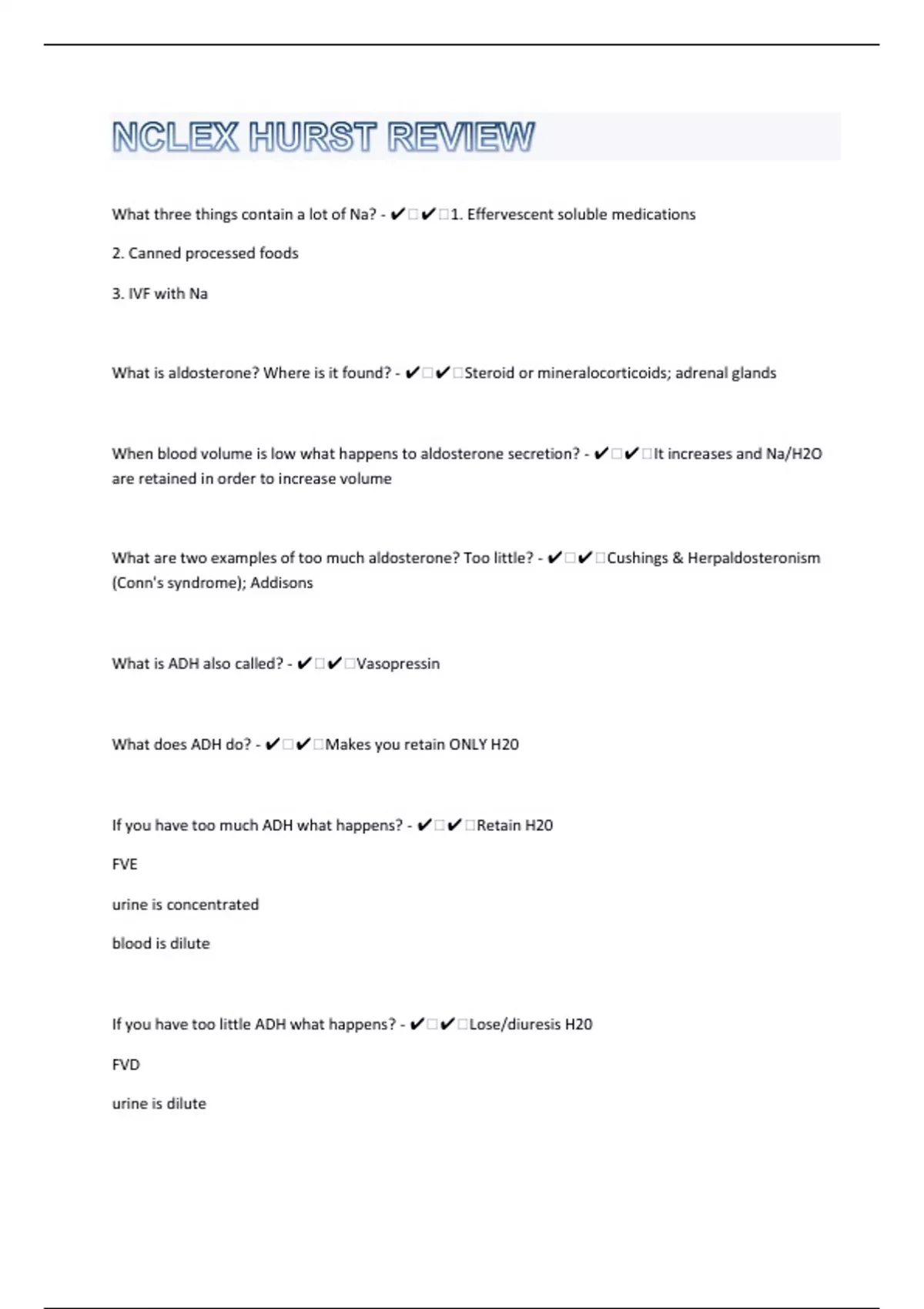 What three things contain a lot of Na? - ️️1. Effervescent soluble medications 2. Canned processed foods 3. IVF with Na What is aldosterone? Where is it found? - ️️Steroid or mineralocorticoids; adrenal glands When blood volume is low what happens to aldosterone secretion? - ️️It increases and Na/H2O are retained in order to increase volume What are two examples of too much aldosterone? Too little? - ️️Cushings & Herpaldosteronism (Conn's syndrome); Addisons What is ADH also called? - ️️Vasopressin What does ADH do? - ️️Makes you retain ONLY H20 If you have too much ADH what happens? - ️️Retain H20 FVE urine is concentrated blood is dilute If you have too little ADH what happens? - ️️Lose/diuresis H20 FVD urine is dilute blood is concentrated