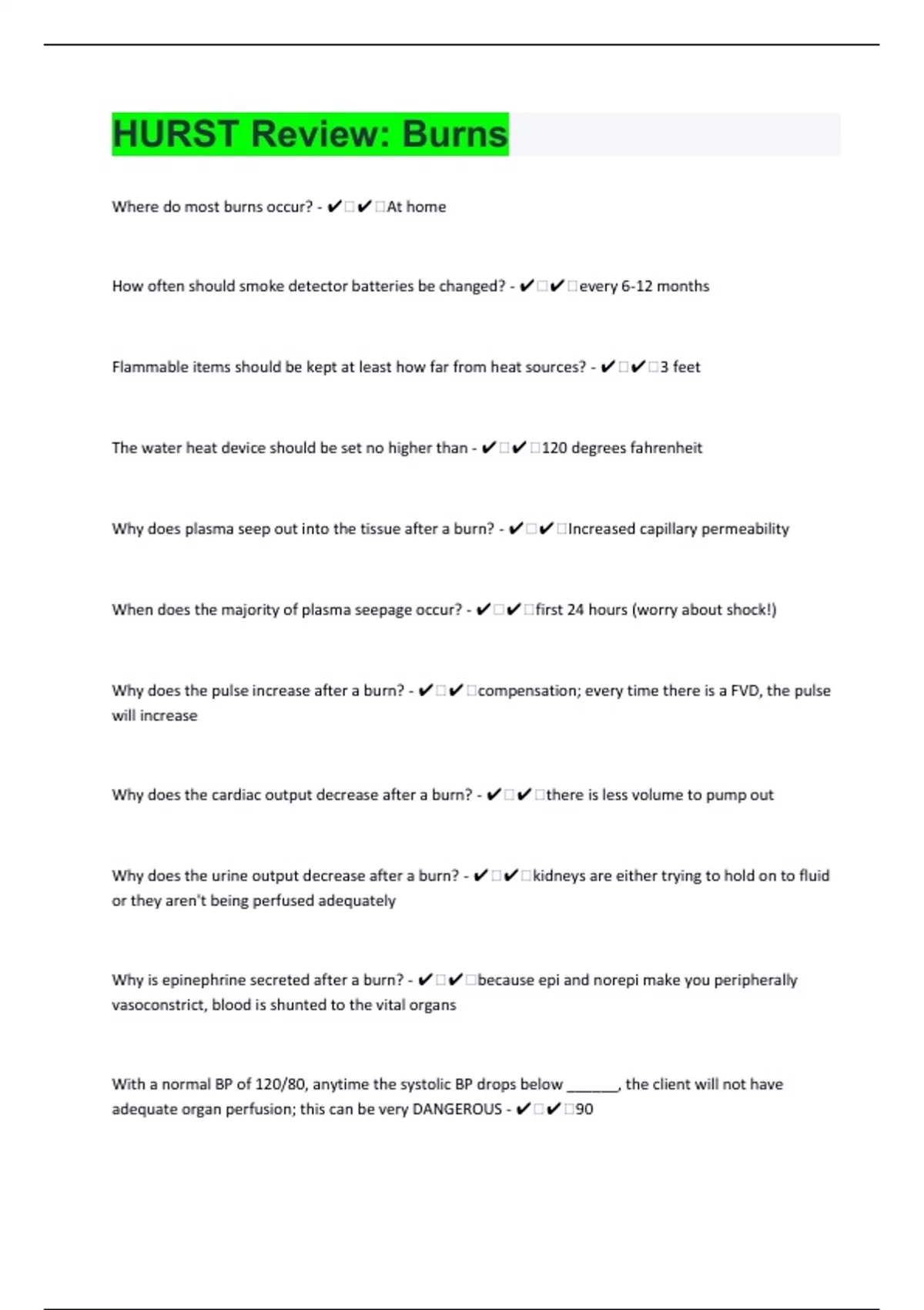 Where do most burns occur? - ️️At home How often should smoke detector batteries be changed? - ️️every 6-12 months Flammable items should be kept at least how far from heat sources? - ️️3 feet The water heat device should be set no higher than - ️️120 degrees fahrenheit Why does plasma seep out into the tissue after a burn? - ️️Increased capillary permeability When does the majority of plasma seepage occur? - ️️first 24 hours (worry about shock!) Why does the pulse increase after a burn? - ️️compensation; every time there is a FVD, the pulse will increase Why does the cardiac output decrease after a burn? - ️️there is less volume to pump out Why does the urine output decrease after a burn? - ️️kidneys are either trying to hold on to fluid or they aren't being perfused adequately Why is epinephrine secreted after a burn? - ️️because epi and norepi make you peripherally vasoconstrict, blood is shunted to the vital organs With a normal BP of 120/80, anytime the systolic BP drops below ______, the client will not have adequate organ perfusion; this can be very DANGEROUS - ️️90