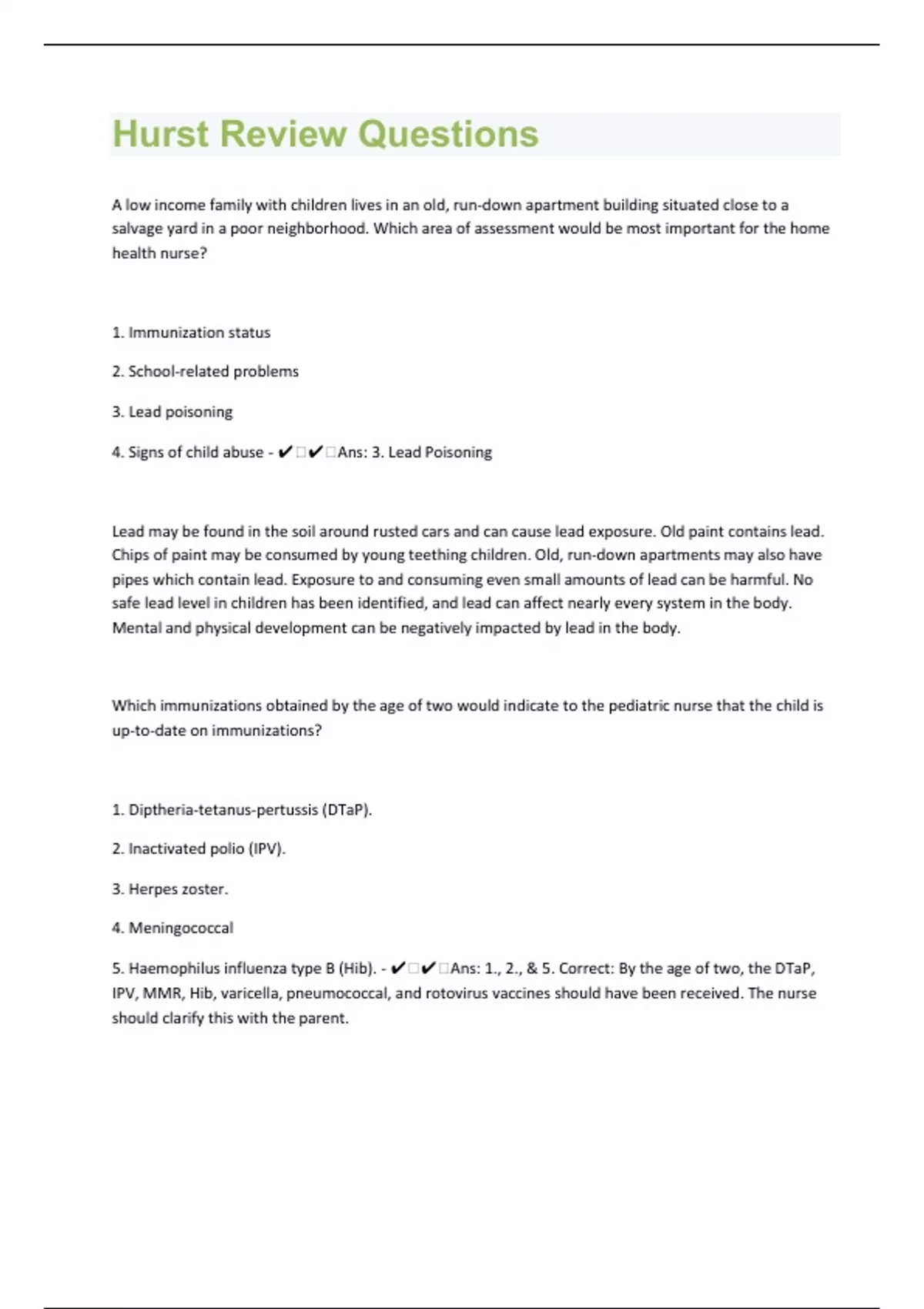 A low income family with children lives in an old, run-down apartment building situated close to a salvage yard in a poor neighborhood. Which area of assessment would be most important for the home health nurse? 1. Immunization status 2. School-related problems 3. Lead poisoning 4. Signs of child abuse - ️️Ans: 3. Lead Poisoning Lead may be found in the soil around rusted cars and can cause lead exposure. Old paint contains lead. Chips of paint may be consumed by young teething children. Old, run-down apartments may also have pipes which contain lead. Exposure to and consuming even small amounts of lead can be harmful. No safe lead level in children has been identified, and lead can affect nearly every system in the body. Mental and physical development can be negatively impacted by lead in the body. Which immunizations obtained by the age of two would indicate to the pediatric nurse that the child is up-to-date on immunizations? 1. Diptheria-tetanus-pertussis (DTaP). 2. Inactivated polio (IPV). 3. Herpes zoster. 4. Meningococcal 5. Haemophilus influenza type B (Hib). - ️️Ans: 1., 2., & 5. Correct: By the age of two, the DTaP, IPV, MMR, Hib, varicella, pneumococcal, and rotovirus vaccines should have been received. The nurse should clarify this with the parent.
