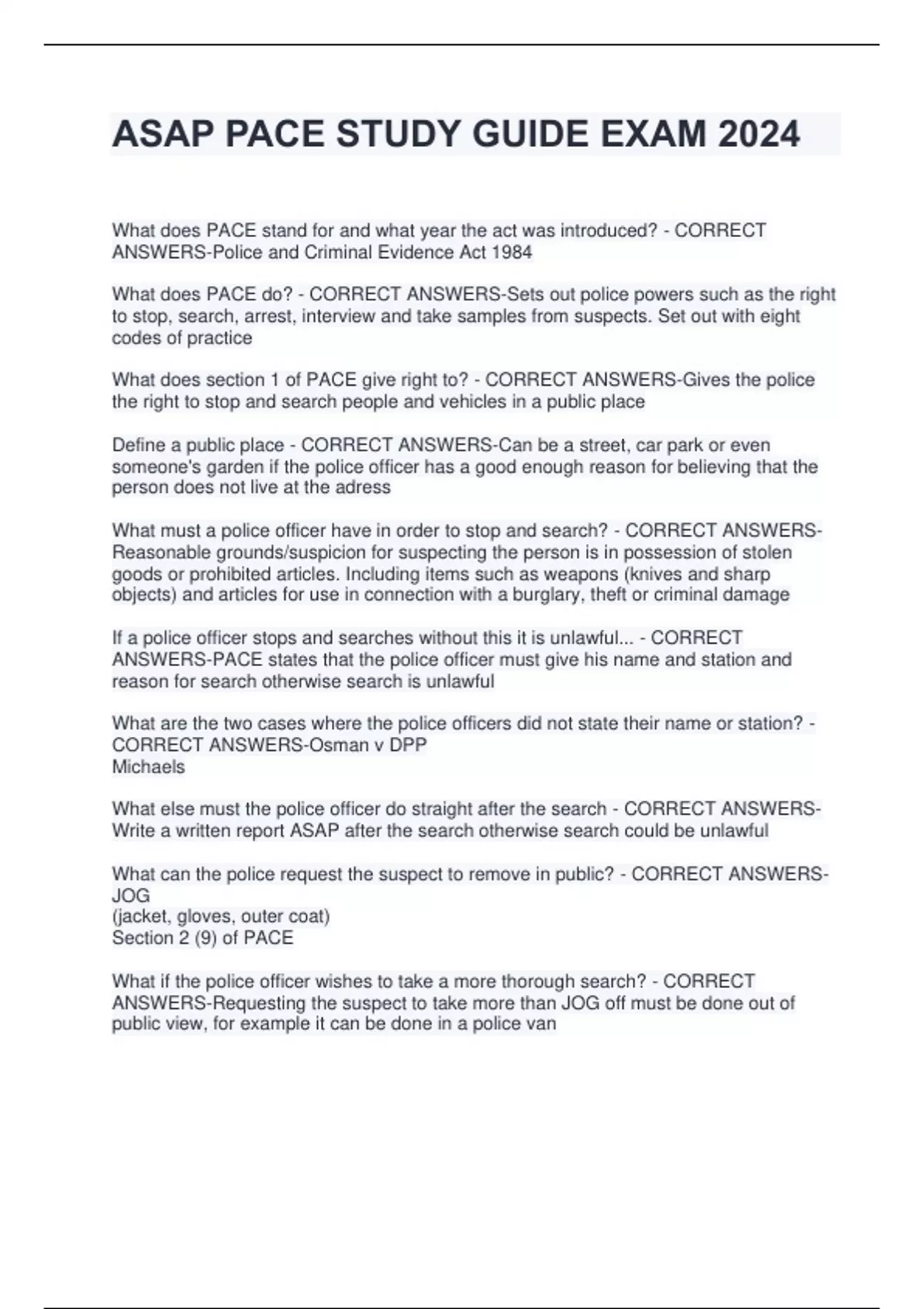 ASAP PACE STUDY GUIDE EXAM 2024 What does PACE stand for and what year the act was introduced? - CORRECT ANSWERS-Police and Criminal Evidence Act 1984 What does PACE do? - CORRECT ANSWERS-Sets out police powers such as the right to stop, search, arrest, interview and take samples from suspects. Set out with eight codes of practice What does section 1 of PACE give right to? - CORRECT ANSWERS-Gives the police the right to stop and search people and vehicles in a public place Define a public place - CORRECT ANSWERS-Can be a street, car park or even someone's garden if the police officer has a good enough reason for believing that the person does not live at the adress What must a police officer have in order to stop and search? - CORRECT ANSWERSReasonable grounds/suspicion for suspecting the person is in possession of stolen goods or prohibited articles. Including items such as weapons (knives and sharp objects) and articles for use in connection with a burglary, theft or criminal damage If a police officer stops and searches without this it is unlawful... - CORRECT ANSWERS-PACE states that the police officer must give his name and station and reason for search otherwise search is unlawful What are the two cases where the police officers did not state their name or station? - CORRECT ANSWERS-Osman v DPP Michaels What else must the police officer do straight after the search - CORRECT ANSWERSWrite a written report ASAP after the search otherwise search could be unlawful What can the police request the suspect to remove in public? - CORRECT ANSWERSJOG (jacket, gloves, outer coat) Section 2 (9) of PACE What if the police officer wishes to take a more thorough search? - CORRECT ANSWERS-Requesting the suspect to take more than JOG off must be done out of public view, for example it can be done in a police van