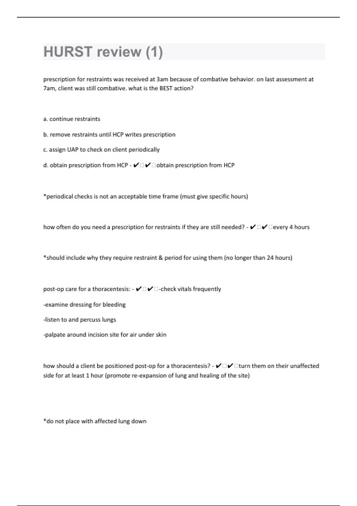prescription for restraints was received at 3am because of combative behavior. on last assessment at 7am, client was still combative. what is the BEST action? a. continue restraints b. remove restraints until HCP writes prescription c. assign UAP to check on client periodically d. obtain prescription from HCP - ️️obtain prescription from HCP *periodical checks is not an acceptable time frame (must give specific hours) how often do you need a prescription for restraints if they are still needed? - ️️every 4 hours *should include why they require restraint & period for using them (no longer than 24 hours) post-op care for a thoracentesis: - ️️-check vitals frequently -examine dressing for bleeding -listen to and percuss lungs -palpate around incision site for air under skin how should a client be positioned post-op for a thoracentesis? - ️️turn them on their unaffected side for at least 1 hour (promote re-expansion of lung and healing of the site) *do not place with affected lung down
