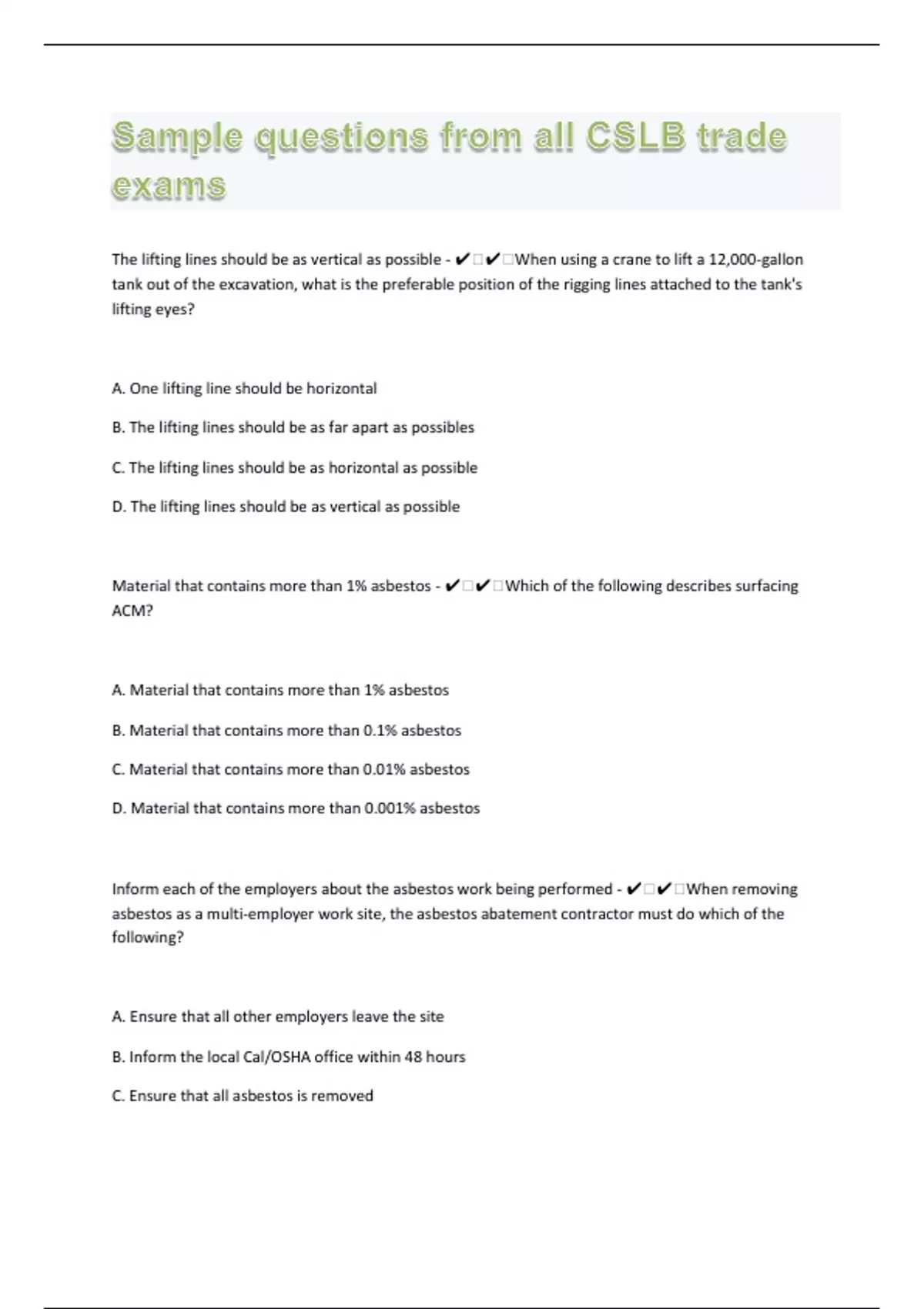 The lifting lines should be as vertical as possible - ️️When using a crane to lift a 12,000-gallon tank out of the excavation, what is the preferable position of the rigging lines attached to the tank's lifting eyes? A. One lifting line should be horizontal B. The lifting lines should be as far apart as possibles C. The lifting lines should be as horizontal as possible D. The lifting lines should be as vertical as possible Material that contains more than 1% asbestos - ️️Which of the following describes surfacing ACM? A. Material that contains more than 1% asbestos B. Material that contains more than 0.1% asbestos C. Material that contains more than 0.01% asbestos D. Material that contains more than 0.001% asbestos Inform each of the employers about the asbestos work being performed - ️️When removing asbestos as a multi-employer work site, the asbestos abatement contractor must do which of the following? A. Ensure that all other employers leave the site B. Inform the local Cal/OSHA office within 48 hours C. Ensure that all asbestos is removed D. Inform each of the employers about the asbestos work being performed.