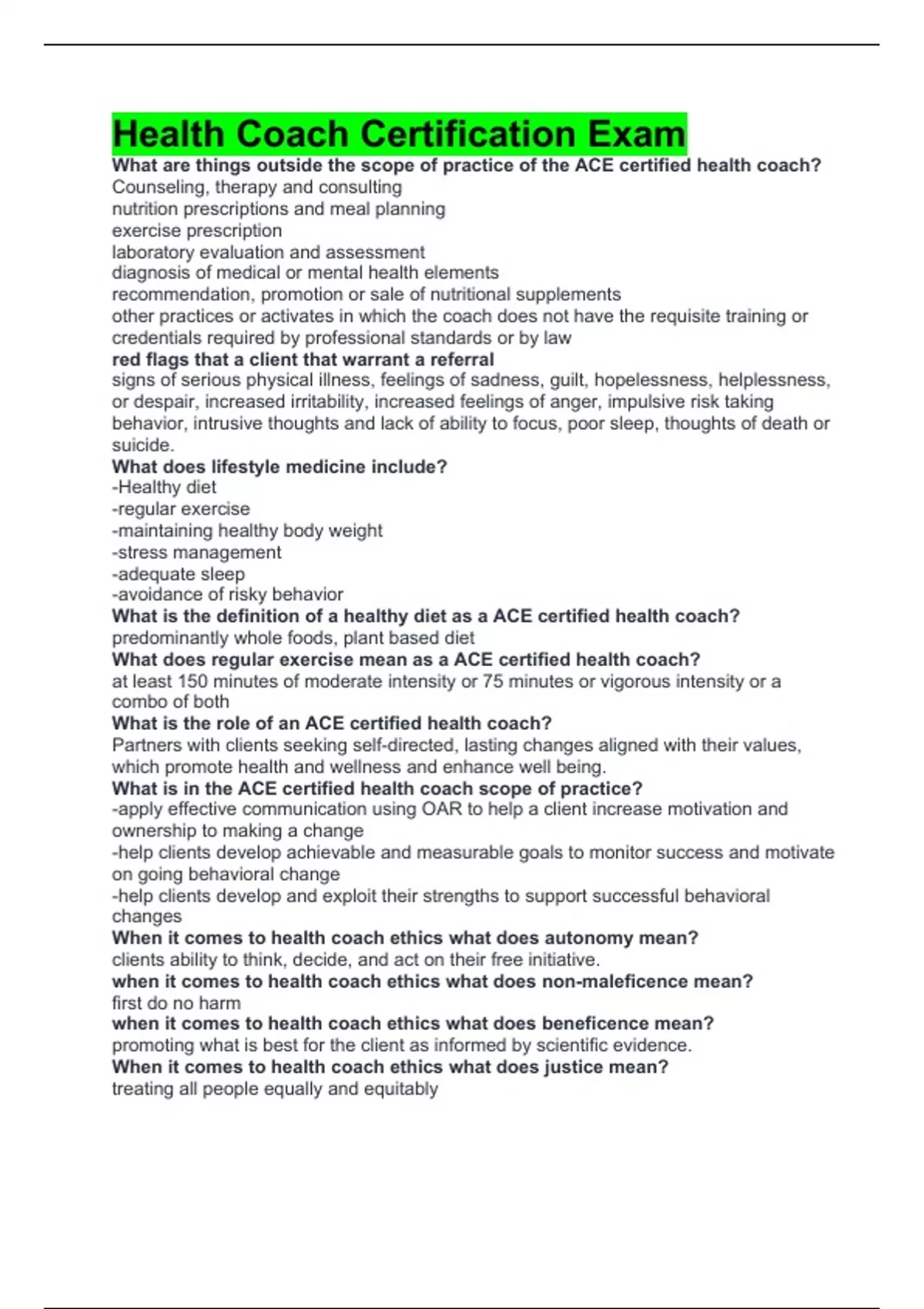 Health Coach Certification Exam What are things outside the scope of practice of the ACE certified health coach? Counseling, therapy and consulting nutrition prescriptions and meal planning exercise prescription laboratory evaluation and assessment diagnosis of medical or mental health elements recommendation, promotion or sale of nutritional supplements other practices or activates in which the coach does not have the requisite training or credentials required by professional standards or by law red flags that a client that warrant a referral signs of serious physical illness, feelings of sadness, guilt, hopelessness, helplessness, or despair, increased irritability, increased feelings of anger, impulsive risk taking behavior, intrusive thoughts and lack of ability to focus, poor sleep, thoughts of death or suicide. What does lifestyle medicine include? -Healthy diet -regular exercise -maintaining healthy body weight -stress management -adequate sleep -avoidance of risky behavior What is the definition of a healthy diet as a ACE certified health coach? predominantly whole foods, plant based diet What does regular exercise mean as a ACE certified health coach? at least 150 minutes of moderate intensity or 75 minutes or vigorous intensity or a combo of both What is the role of an ACE certified health coach? Partners with clients seeking self-directed, lasting changes aligned with their values, which promote health and wellness and enhance well being. What is in the ACE certified health coach scope of practice? -apply effective communication using OAR to help a client increase motivation and ownership to making a change -help clients develop achievable and measurable goals to monitor success and motivate on going behavioral change -help clients develop and exploit their strengths to support successful behavioral changes When it comes to health coach ethics what does autonomy mean? clients ability to think, decide, and act on their free initiative. when it comes to health coach ethics what does non-maleficence mean? first do no harm when it comes to health coach ethics what does beneficence mean? promoting what is best for the client as informed by scientific evidence. When it comes to health coach ethics what does justice mean? treating all people equally and equitably