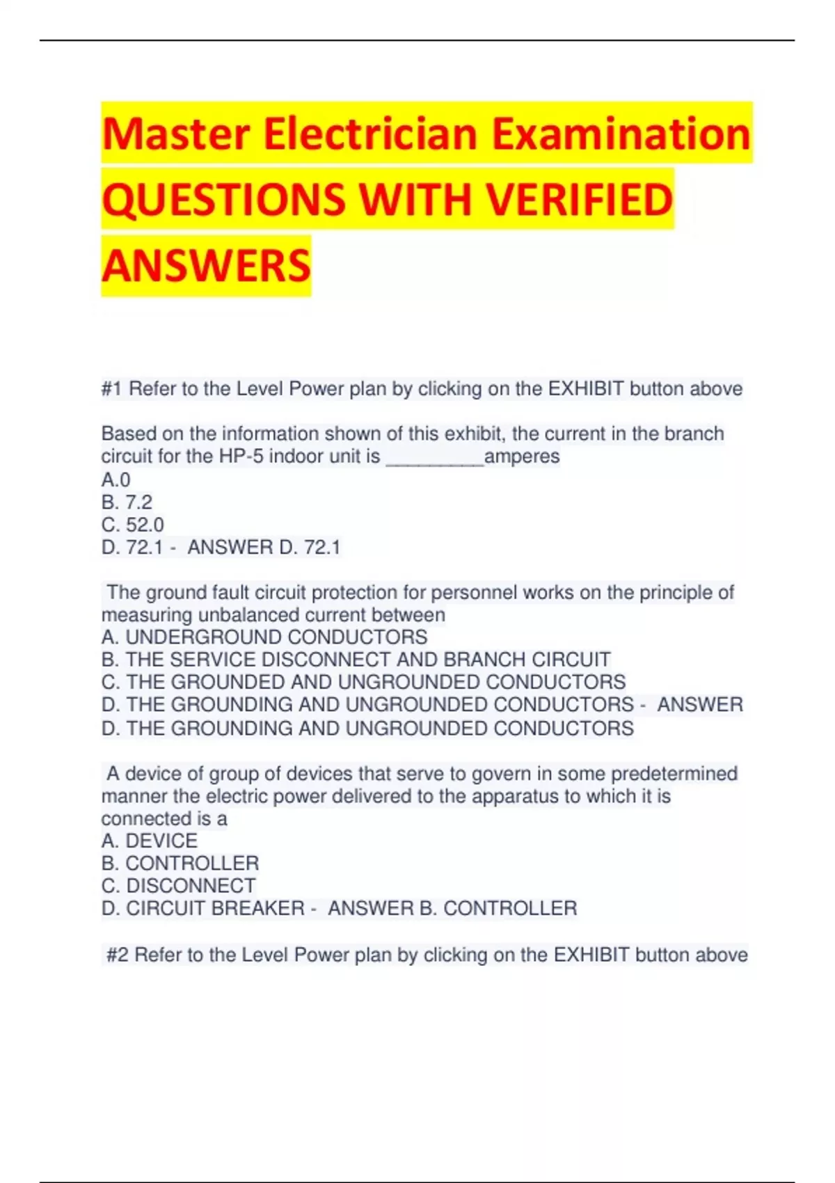 Master Electrician Examination QUESTIONS WITH VERIFIED ANSWERS #1 Refer to the Level Power plan by clicking on the EXHIBIT button above Based on the information shown of this exhibit, the current in the branch circuit for the HP-5 indoor unit is _________amperes A.0 B. 7.2 C. 52.0 D. 72.1 - ANSWER D. 72.1 The ground fault circuit protection for personnel works on the principle of measuring unbalanced current between A. UNDERGROUND CONDUCTORS B. THE SERVICE DISCONNECT AND BRANCH CIRCUIT C. THE GROUNDED AND UNGROUNDED CONDUCTORS D. THE GROUNDING AND UNGROUNDED CONDUCTORS - ANSWER D. THE GROUNDING AND UNGROUNDED CONDUCTORS A device of group of devices that serve to govern in some predetermined manner the electric power delivered to the apparatus to which it is connected is a A. DEVICE B. CONTROLLER C. DISCONNECT D. CIRCUIT BREAKER - ANSWER B. CONTROLLER #2 Refer to the Level Power plan by clicking on the EXHIBIT button above For the circuit that serves the outside HP-5 motor compressor conditioning unit, the maximum rating of the inverse time breaker permitted to provide short-circuit is ___amperes A. 40 B. 45 C. 60 D. 70 - ANSWER C. 60 Give: Two separate services are identical in voltage and amperage, except that one service serves on motor loads and the other serves lighting loads only. In the event of a short circuit in these services, the available short-circuit current will be A. THE SAME IN EITHER SERVICE B. 25 PERCENT GREATER IN THE SERVICE FOR THE MOTOR LOAD C. HIGHER IN THE LIGHTING-LOAD SERVICE BECAUSE OF CONTINUOUS LOADS D. HIGHER IN THE MOTOR-LOAD SERVICE BECAUSE OF THE INDUCTIVE REACTANCE FROM THE MOTORS. - ANSWER B. 25 PERCENT GREATER IN THE SERVICE FOR THE MOTOR LOAD #3 Refer to the Electrical Feeder Diagram by clicking on the EXHIBIT button above Given: The maximum load must not exceed 80 percent of the ampere rating of the main breaker, and the maximum load must not exceed 80 percent of the ampacity of the service entrance conductors. The service entrance conductors have XHHW insulation. The voltage is 208 What is the maximum balanced electrical load permitted, in volt-amperes, for the new service? A. 57, 600 B. 99, 840 C. 172, 927 C. 178, 692 - ANSWER A. 57, 600 Given: A 3-phase system has a line current of 150 amperes and a line voltage of 208 volts. Determine the total volt-ampere load for the above. A. 18, 000 B. 31, 200 C.54, 040 D. 93, 600 - ANSWER C.54, 040 Given: Acircuit supplying a resistive load has a total current reading of 27 amperes. The resistance of a faulty connection is 0.21 ohms. The power by the faulty connection is ____ watts. A. 0.2 B. 5.7 C. 54 D. 153 - ANSWER B. 5.7 In a step-down voltage transformer, the current in the secondary is approximately equal to the: