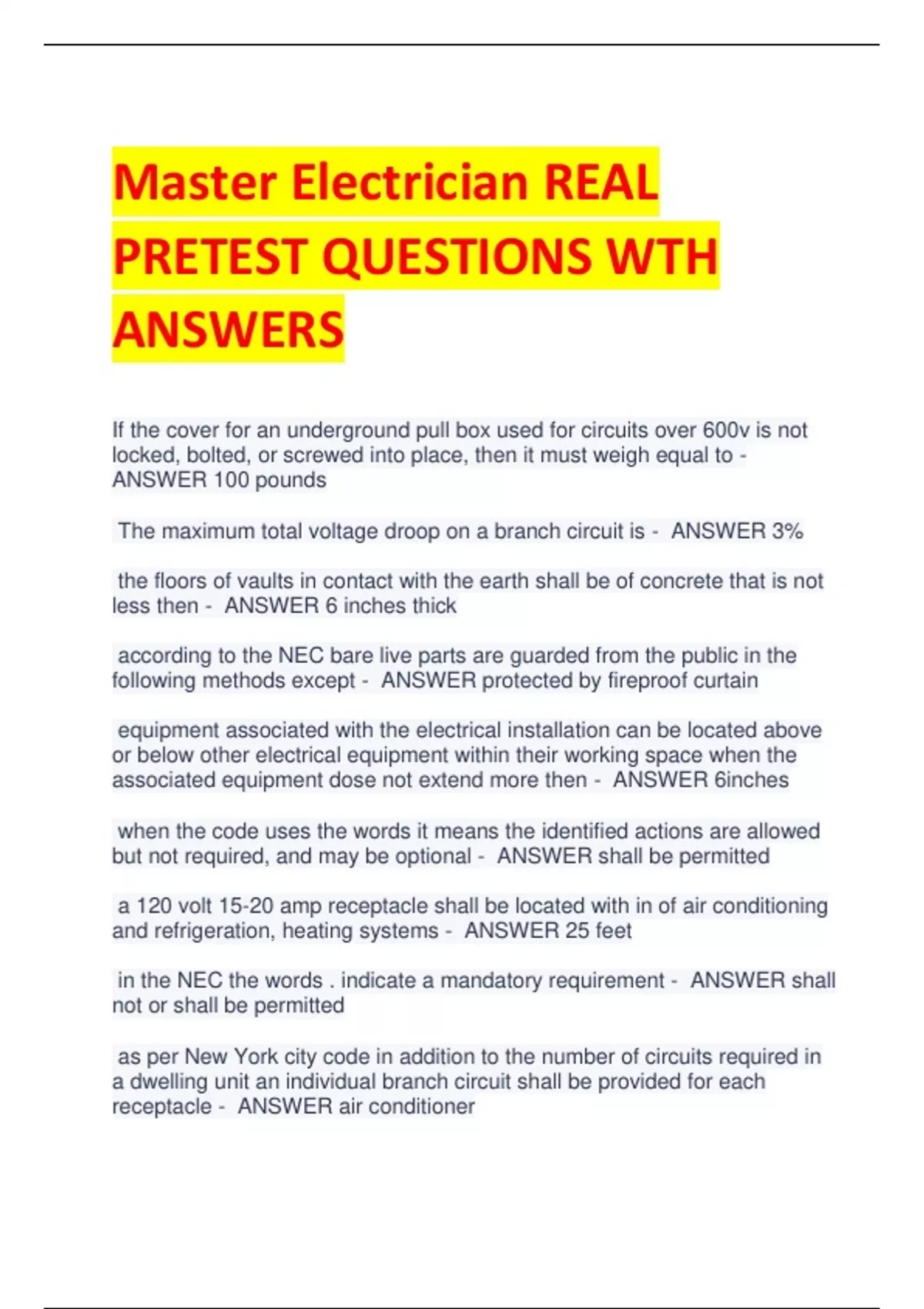 Master Electrician REAL PRETEST QUESTIONS WTH ANSWERS If the cover for an underground pull box used for circuits over 600v is not locked, bolted, or screwed into place, then it must weigh equal to - ANSWER 100 pounds The maximum total voltage droop on a branch circuit is - ANSWER 3% the floors of vaults in contact with the earth shall be of concrete that is not less then - ANSWER 6 inches thick according to the NEC bare live parts are guarded from the public in the following methods except - ANSWER protected by fireproof curtain equipment associated with the electrical installation can be located above or below other electrical equipment within their working space when the associated equipment dose not extend more then - ANSWER 6inches when the code uses the words it means the identified actions are allowed but not required, and may be optional - ANSWER shall be permitted a 120 volt 15-20 amp receptacle shall be located with in of air conditioning and refrigeration, heating systems - ANSWER 25 feet in the NEC the words . indicate a mandatory requirement - ANSWER shall not or shall be permitted as per New York city code in addition to the number of circuits required in a dwelling unit an individual branch circuit shall be provided for each receptacle - ANSWER air conditioner the dimensions of working space for access to live parts operating at 300 volts normally to ground where exposed to live parts on both sides of the workspace is - ANSWER 4 feet when leads are supplied with lampholders with lamp holders the conductor attached to the screw shell shall have a finish - ANSWER white or gray how many receptacles are required within the perimeter of the balcony, deck or porch with the useable . area of 20 sq ft - ANSWER one where conductors