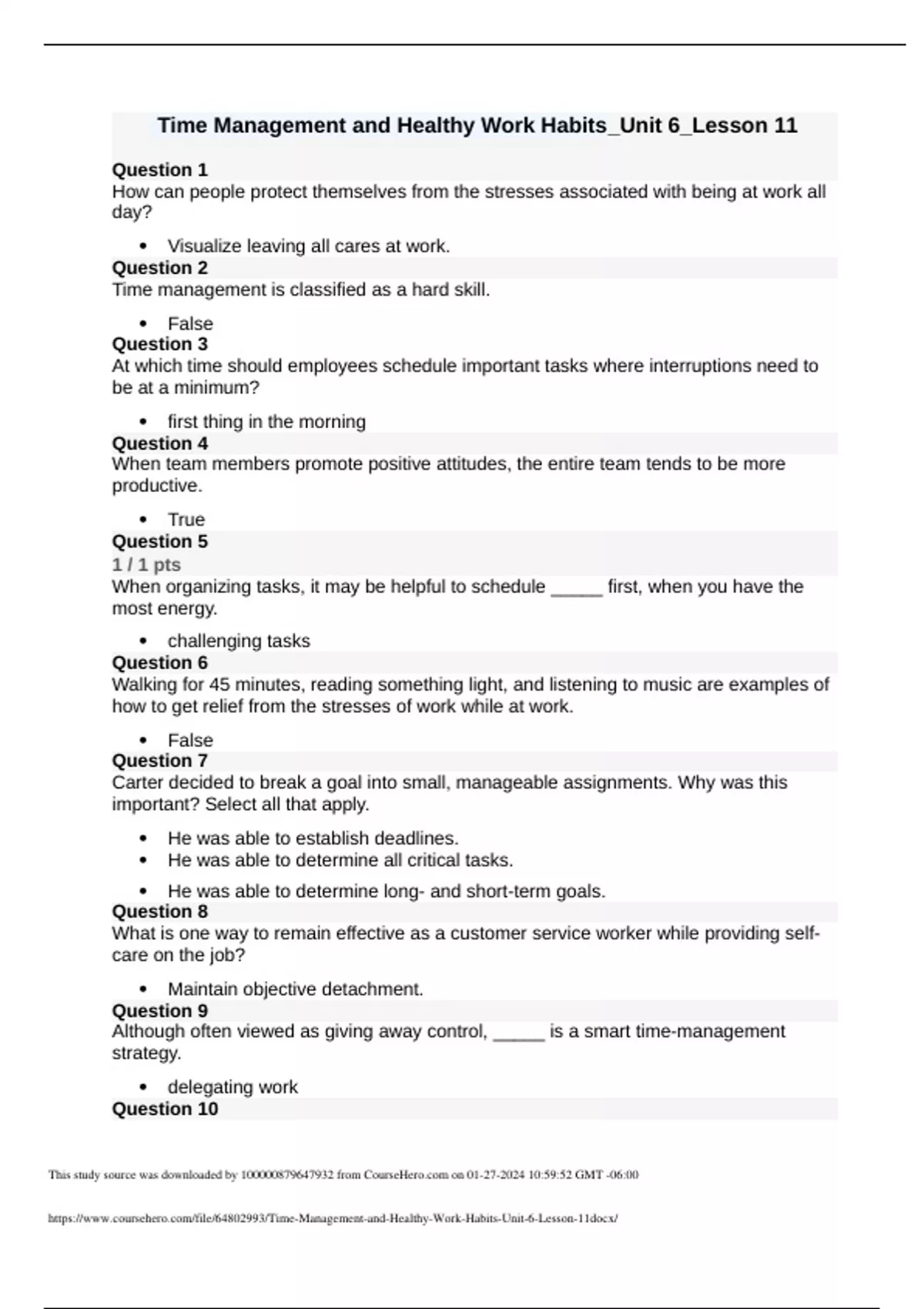 Time Management and Healthy Work Habits_Unit 6_Lesson 11 Question 1 How can people protect themselves from the stresses associated with being at work all day? Visualize leaving all cares at work. Question 2 Time management is classified as a hard skill. False Question 3 At which time should employees schedule important tasks where interruptions need to be at a minimum? first thing in the morning Question 4 When team members promote positive attitudes, the entire team tends to be more productive. True Question 5 1 / 1 pts When organizing tasks, it may be helpful to schedule _____ first, when you have the most energy. challenging tasks Question 6 Walking for 45 minutes, reading something light, and listening to music are examples of how to get relief from the stresses of work while at work.