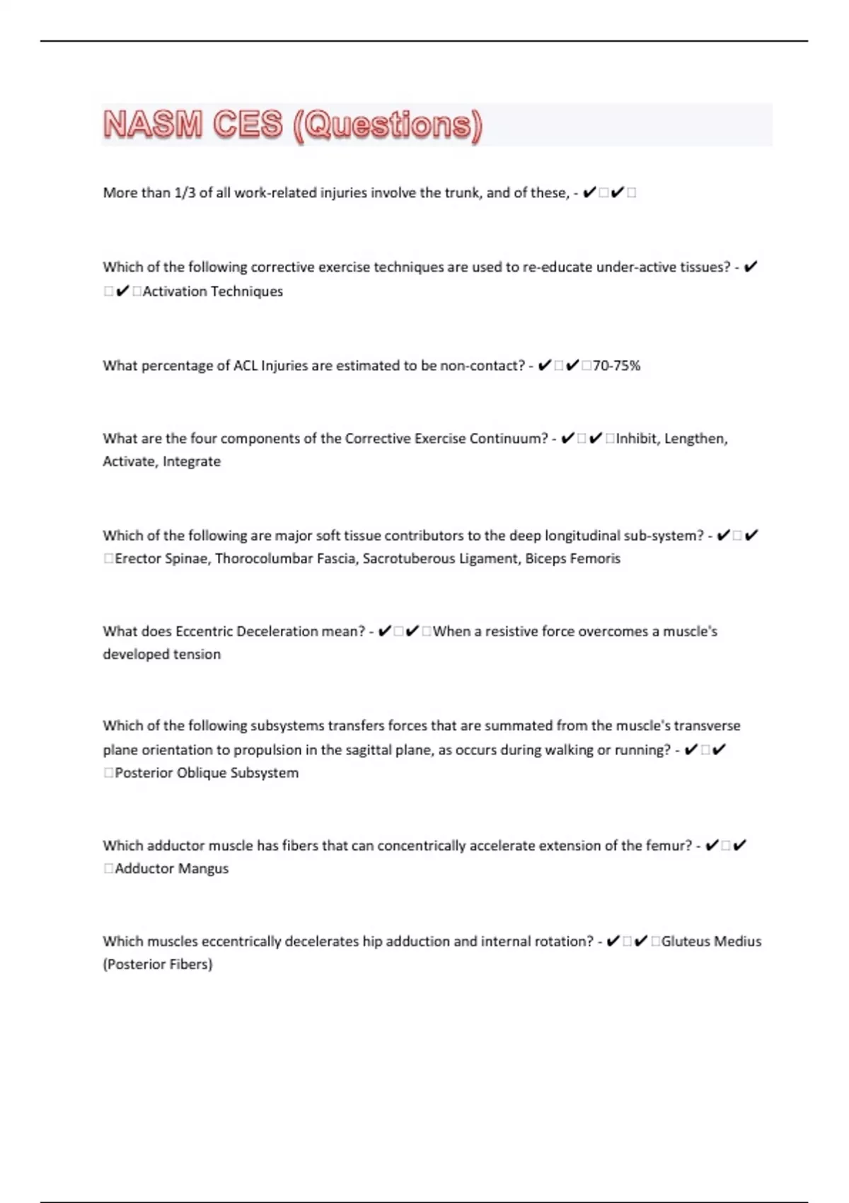 More than 1/3 of all work-related injuries involve the trunk, and of these, - ️️ Which of the following corrective exercise techniques are used to re-educate under-active tissues? - ️️Activation Techniques What percentage of ACL Injuries are estimated to be non-contact? - ️️70-75% What are the four components of the Corrective Exercise Continuum? - ️️Inhibit, Lengthen, Activate, Integrate Which of the following are major soft tissue contributors to the deep longitudinal sub-system? - ️️Erector Spinae, Thorocolumbar Fascia, Sacrotuberous Ligament, Biceps Femoris What does Eccentric Deceleration mean? - ️️When a resistive force overcomes a muscle's developed tension Which of the following subsystems transfers forces that are summated from the muscle's transverse plane orientation to propulsion in the sagittal plane, as occurs during walking or running? - ️️Posterior Oblique Subsystem Which adductor muscle has fibers that can concentrically accelerate extension of the femur? - ️️Adductor Mangus Which muscles eccentrically decelerates hip adduction and internal rotation? - ️️Gluteus Medius (Posterior Fibers)