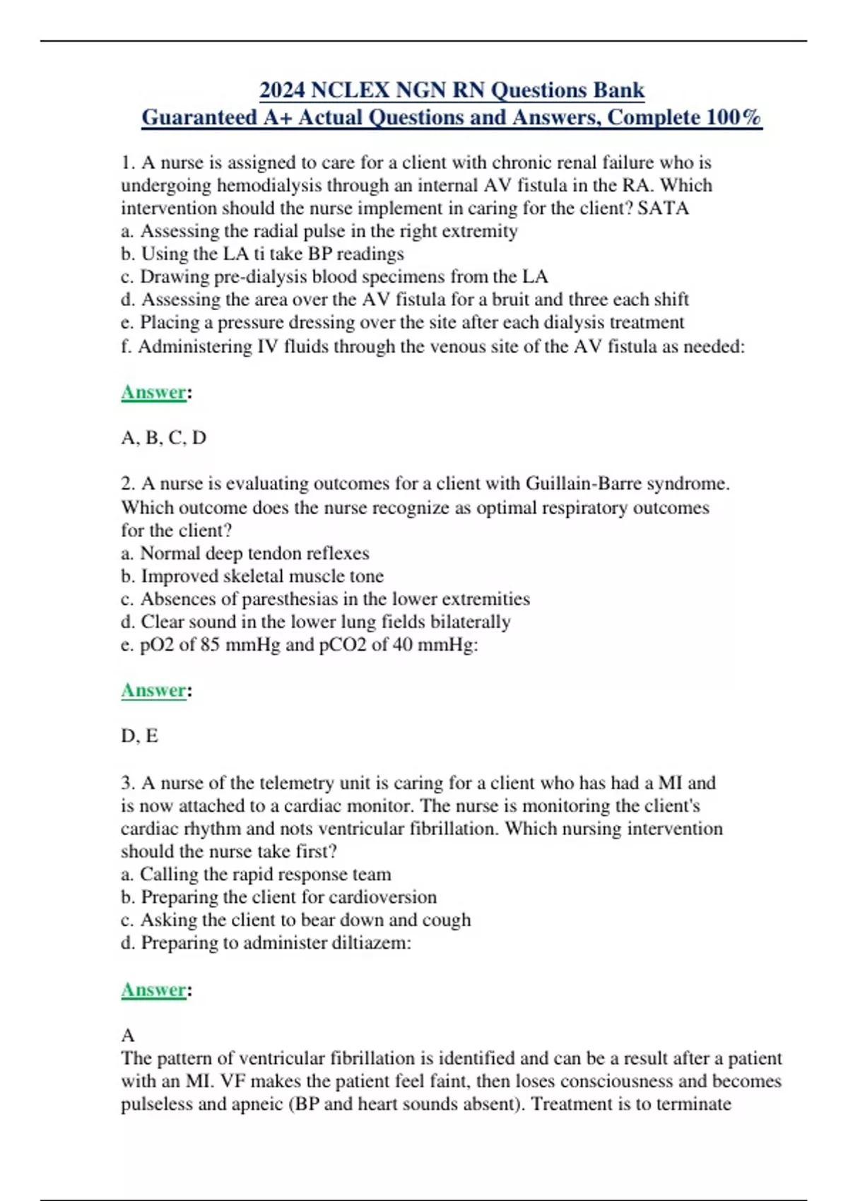 2024 NCLEX NGN RN Questions Bank Guaranteed A+ Actual Questions and Answers, Complete 100% 1. A nurse is assigned to care for a client with chronic renal failure who is undergoing hemodialysis through an internal AV fistula in the RA. Which intervention should the nurse implement in caring for the client? SATA a. Assessing the radial pulse in the right extremity b. Using the LA ti take BP readings c. Drawing pre-dialysis blood specimens from the LA d. Assessing the area over the AV fistula for a bruit and three each shift e. Placing a pressure dressing over the site after each dialysis treatment f. Administering IV fluids through the venous site of the AV fistula as needed: Answer: A, B, C, D 2. A nurse is evaluating outcomes for a client with Guillain-Barre syndrome. Which outcome does the nurse recognize as optimal respiratory outcomes for the client? a. Normal deep tendon reflexes b. Improved skeletal muscle tone c. Absences of paresthesias in the lower extremities d. Clear sound in the lower lung fields bilaterally e. pO2 of 85 mmHg and pCO2 of 40 mmHg: Answer: D, E 3. A nurse of the telemetry unit is caring for a client who has had a MI and is now attached to a cardiac monitor. The nurse is monitoring the client's cardiac rhythm and nots ventricular fibrillation. Which nursing intervention should the nurse take first? a. Calling the rapid response team b. Preparing the client for cardioversion c. Asking the client to bear down and cough d. Preparing to administer diltiazem: Answer: A The pattern of ventricular fibrillation is identified and can be a result after a patient with an MI. VF makes the patient feel faint, then loses consciousness and becomes pulseless and apneic (BP and heart sounds absent). Treatment is to terminate VF and covert it into a rhythm via defibrillation-> call a rapid and initiate CPR. Cardioversion is used for ventricular or supraventricular tachydysrhythmias