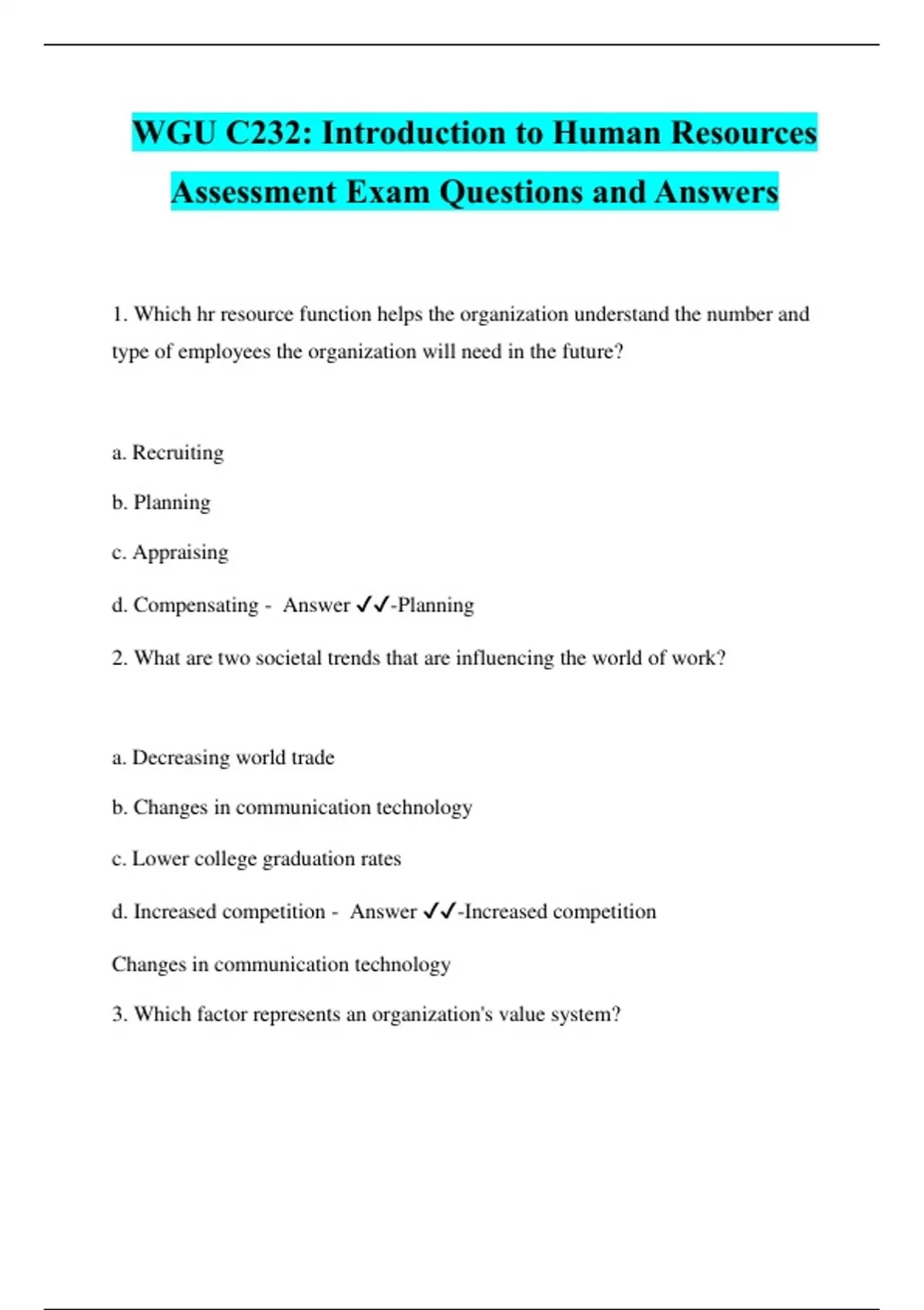 1. Which hr resource function helps the organization understand the number and type of employees the organization will need in the future? a. Recruiting b. Planning c. Appraising d. Compensating - Answer ️️-Planning 2. What are two societal trends that are influencing the world of work? a. Decreasing world trade b. Changes in communication technology c. Lower college graduation rates d. Increased competition - Answer ️️-Increased competition