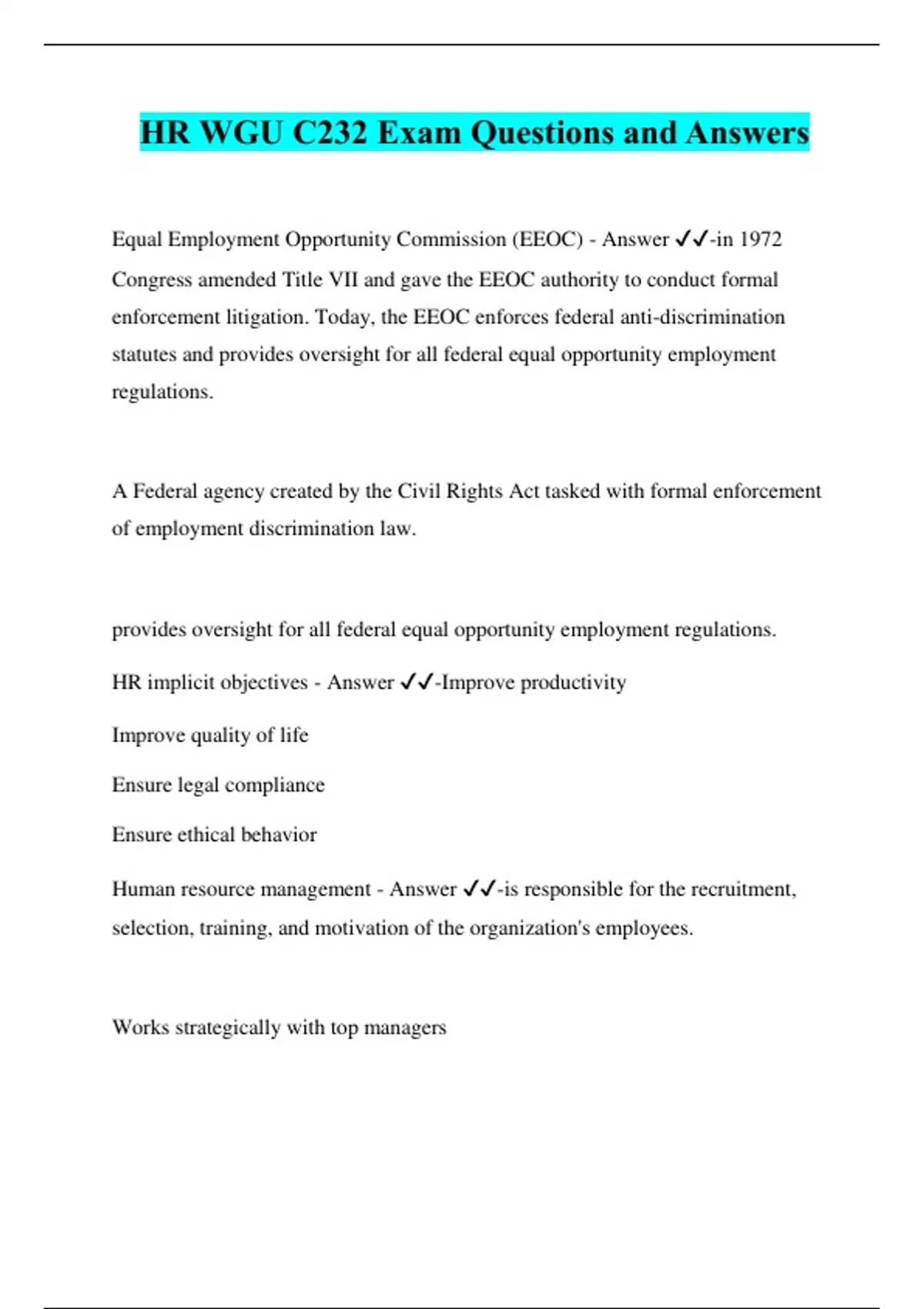 Equal Employment Opportunity Commission (EEOC) - Answer ️️-in 1972 Congress amended Title VII and gave the EEOC authority to conduct formal enforcement litigation. Today, the EEOC enforces federal anti-discrimination statutes and provides oversight for all federal equal opportunity employment regulations. A Federal agency created by the Civil Rights Act tasked with formal enforcement of employment discrimination law. provides oversight for all federal equal opportunity employment regulations.