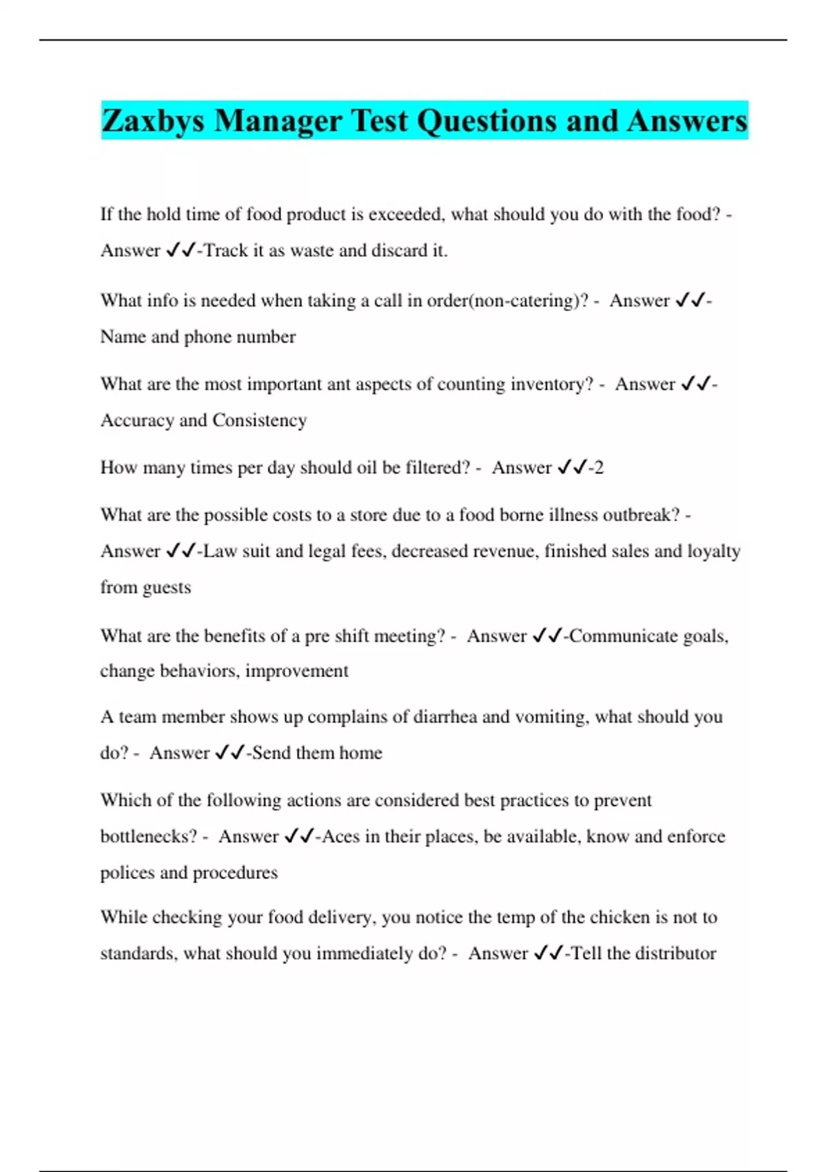 If the hold time of food product is exceeded, what should you do with the food? - Answer ️️-Track it as waste and discard it. What info is needed when taking a call in order(non-catering)? - Answer ️️-Name and phone number What are the most important ant aspects of counting inventory? - Answer ️️-Accuracy and Consistency