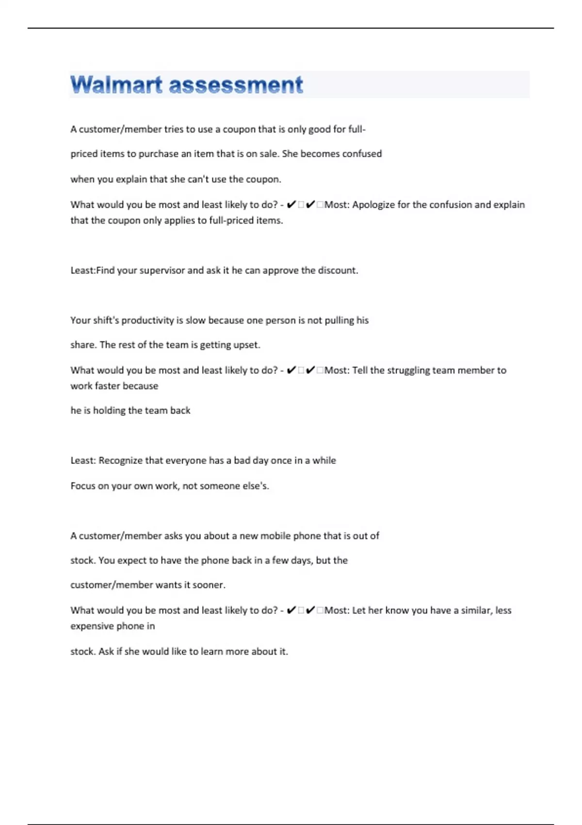 A customer/member tries to use a coupon that is only good for full- priced items to purchase an item that is on sale. She becomes confused when you explain that she can't use the coupon. What would you be most and least likely to do? - ️️Most: Apologize for the confusion and explain that the coupon only applies to full-priced items. Least:Find your supervisor and ask it he can approve the discount. Your shift's productivity is slow because one person is not pulling his share. The rest of the team is getting upset. What would you be most and least likely to do? - ️️Most: Tell the struggling team member to work faster because he is holding the team back Least: Recognize that everyone has a bad day once in a while Focus on your own work, not someone else's. A customer/member asks you about a new mobile phone that is out of stock. You expect to have the phone back in a few days, but the customer/member wants it sooner. What would you be most and least likely to do? - ️️Most: Let her know you have a similar, less expensive phone in stock. Ask if she would like to learn more about it.