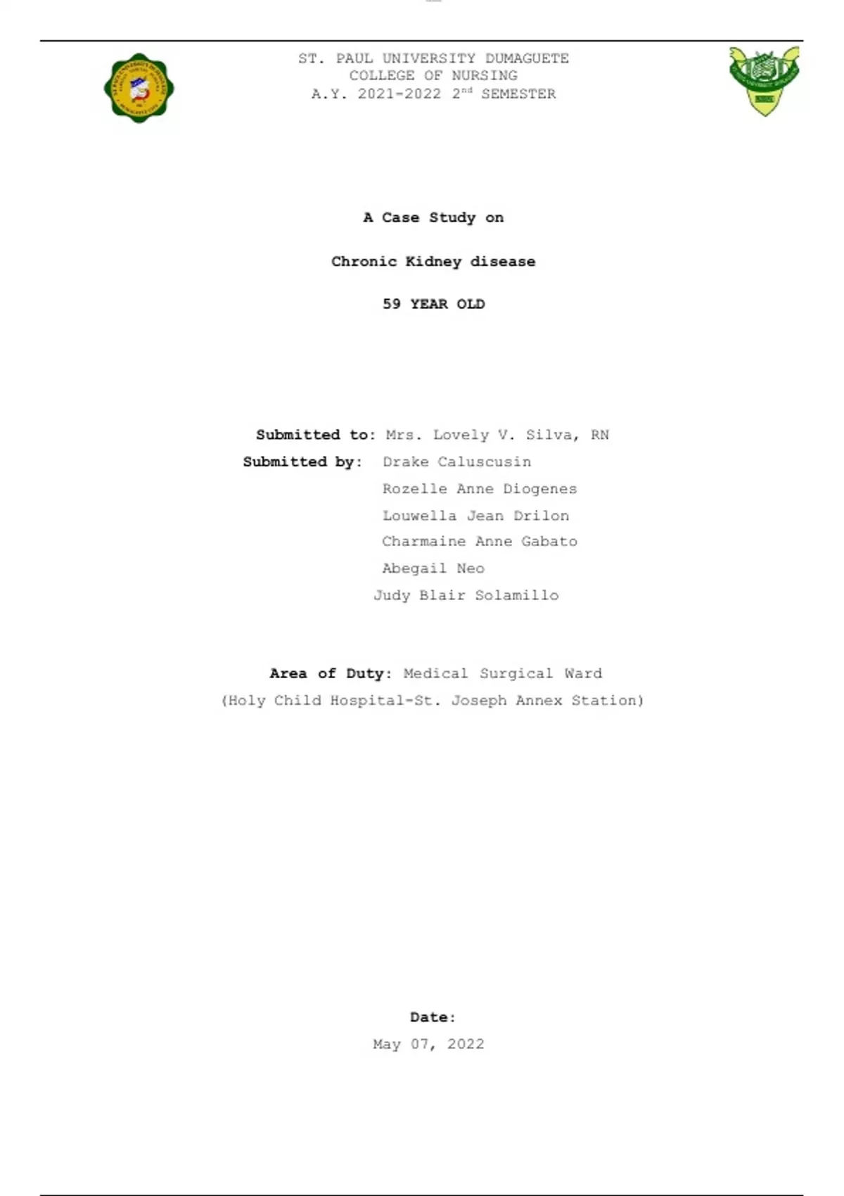 A Case Study on Chronic Kidney disease 59 YEAR OLD Submitted to: Mrs. Lovely V. Silva, RN Submitted by: Drake Caluscusin Rozelle Anne Diogenes Louwella Jean Drilon Charmaine Anne Gabato Abegail Neo Judy Blair Solamillo Area of Duty: Medical Surgical Ward (Holy Child Hospital-St. Joseph Annex Station) Date: May 07, 2022 lOMoARcPSD| ST. PAUL UNIVERSITY DUMAGUETE COLLEGE OF NURSING A.Y. nd SEMESTER 1 | P a g e lOMoARcPSD| ST. PAUL UNIVERSITY DUMAGUETE COLLEGE OF NURSING A.Y. nd SEMESTER ACKNOWLEDGMENT The making of this clinical paper was made possible through the assistance, guidance, inspiration and encouragement made by following people that will be mentioned in this part. They have been the corner stones who gave stability and success to this clinical paper. We the student nurses would like to express a heartfelt gratitude and humble thanks to the following: First of all. To God up above who is always watching and guiding over us especially through times of distress and success in making this clinical paper. We are thankful for his unconditional love, blessings and strength that he has given to us and a smile painted on our faces. Thankful because without his guidance and love, we would not have the strength to overcome our pressures and stress and for giving us the fighting spirit to beat all odds just to finish our task. All glory and honor in him alone together with the Holy Spirit and Jesus Christ his Son will reign forever and ever. To our beloved clinical instructor Ms. Lovely V. Silva who is always there guiding, teaching and letting us experience what is nursing all about, and who lends us her helping hands and giving her effort and time to make us learn and answers our confusions and giving feedback on what is wrong and right for us to fully grasp the concepts needed for the accomplishment of our clinical duty, and this clinical duty was the memorable one.