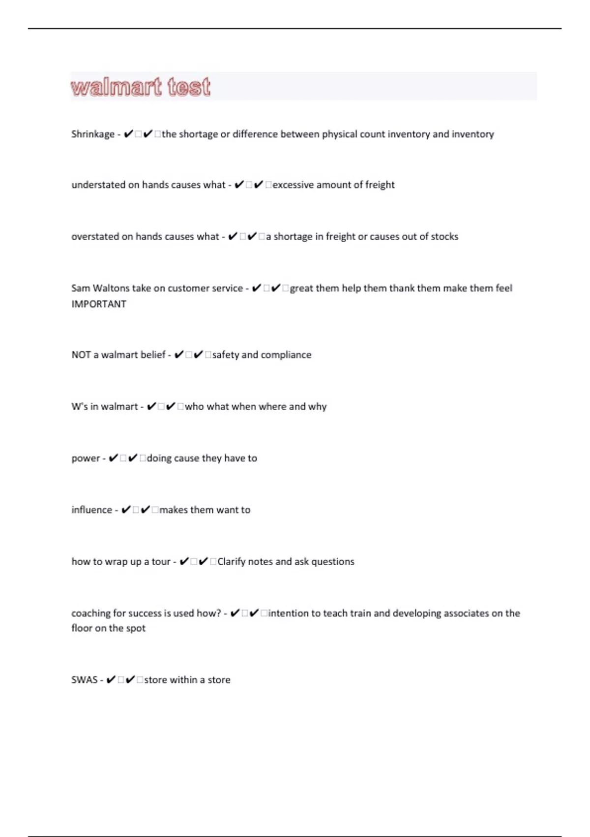 Shrinkage - ️️the shortage or difference between physical count inventory and inventory understated on hands causes what - ️️excessive amount of freight overstated on hands causes what - ️️a shortage in freight or causes out of stocks Sam Waltons take on customer service - ️️great them help them thank them make them feel IMPORTANT NOT a walmart belief - ️️safety and compliance W's in walmart - ️️who what when where and why power - ️️doing cause they have to influence - ️️makes them want to how to wrap up a tour - ️️Clarify notes and ask questions coaching for success is used how? - ️️intention to teach train and developing associates on the floor on the spot SWAS - ️️store within a store