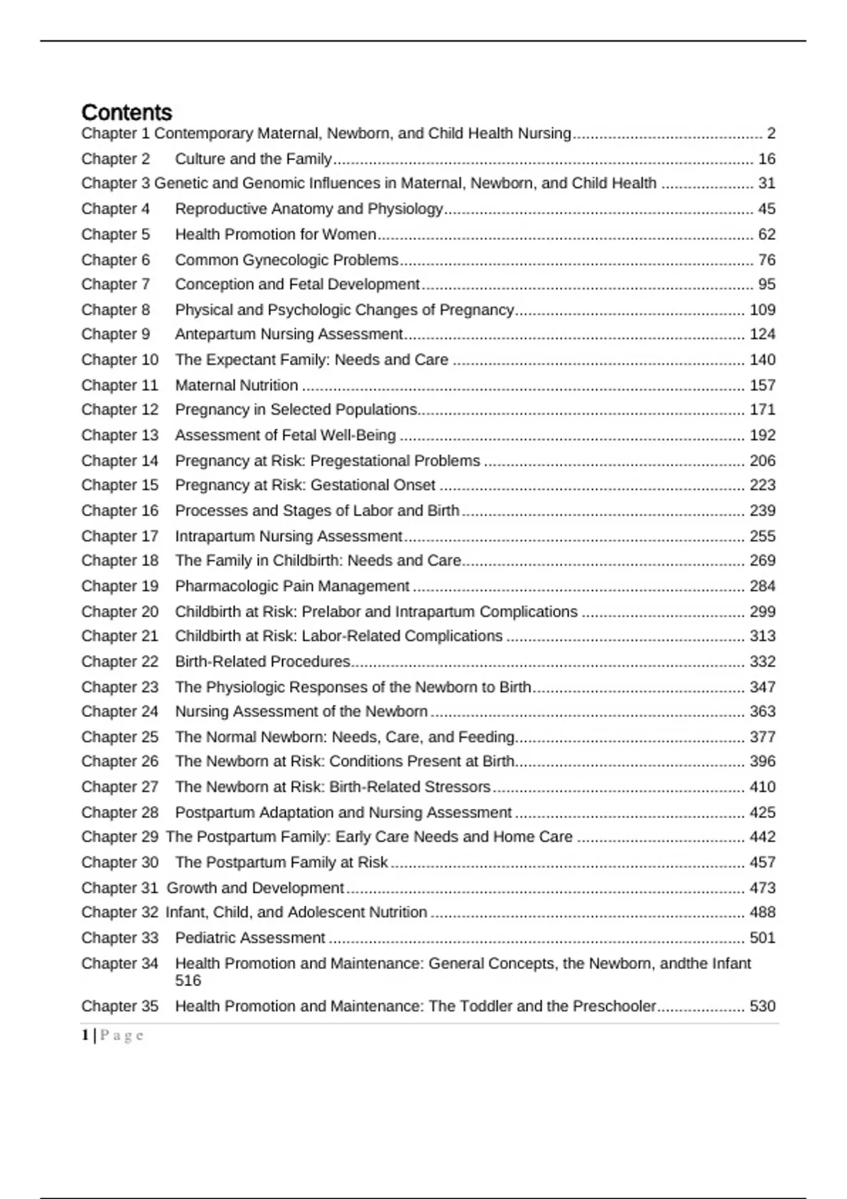 TEST BANK MATERNAL AND CHILD NURSING CARE 5TH EDITION BY LONDONContents Chapter 1 Contemporary Maternal, Newborn, and Child Health Nursing ........................................... 2 Chapter 2 Culture and the Family ............................................................................................... 16 Chapter 3 Genetic and Genomic Influences in Maternal, Newborn, and Child Health ..................... 31 Chapter 4 Reproductive Anatomy and Physiology ...................................................................... 45 Chapter 5 Health Promotion for Women ..................................................................................... 62 Chapter 6 Common Gynecologic Problems ................................................................................ 76 Chapter 7 Conception and Fetal Development ........................................................................... 95 Chapter 8 Physical and Psychologic Changes of Pregnancy .................................................... 109 Chapter 9 Antepartum Nursing Assessment ............................................................................. 124 Chapter 10 The Expectant Family: Needs and Care .................................................................. 140 Chapter 11 Maternal Nutrition .................................................................................................... 157 Chapter 12 Pregnancy in Selected Populations.......................................................................... 171 Chapter 13 Assessment of Fetal Well-Being .............................................................................. 192 Chapter 14 Pregnancy at Risk: Pregestational Problems ........................................................... 206 Chapter 15 Pregnancy at Risk: Gestational Onset ..................................................................... 223 Chapter 16 Processes and Stages of Labor and Birth ................................................................ 239 Chapter 17 Intrapartum Nursing Assessment ............................................................................. 255 Chapter 18 The Family in Childbirth: Needs and Care ................................................................ 269 Chapter 19 Pharmacologic Pain Management ........................................................................... 284 Chapter 20 Childbirth at Risk: Prelabor and Intrapartum Complications ..................................... 299 Chapter 21 Childbirth at Risk: Labor-Related Complications ...................................................... 313 Chapter 22 Birth-Related Procedures ......................................................................................... 332 Chapter 23 The Physiologic Responses of the Newborn to Birth ................................................ 347 Chapter 24 Nursing Assessment of the Newborn ....................................................................... 363 Chapter 25 The Normal Newborn: Needs, Care, and Feeding.................................................... 377 Chapter 26 The Newborn at Risk: Conditions Present at Birth.................................................... 396 Chapter 27 The Newborn at Risk: Birth-Related Stressors ......................................................... 410 Chapter 28 Postpartum Adaptation and Nursing Assessment .................................................... 425 Chapter 29 The Postpartum Family: Early Care Needs and Home Care ...................................... 442 Chapter 30 The Postpartum Family at Risk ................................................................................ 457 Chapter 31 Growth and Development .......................................................................................... 473 Chapter 32 Infant, Child, and Adolescent Nutrition ....................................................................... 488 Chapter 33 Pediatric Assessment .............................................................................................. 501 Chapter 34 Health Promotion and Maintenance: General Concepts, the Newborn, and the Infant 516 Chapter 35 Health Promotion and Maintenance: The Toddler and the Preschooler .................... 530 1 | P a g eChapter 36 Health Promotion and Maintenance: The School-Age Child and the Adolescent ......... 545 Chapter 37 Family Assessment and Concepts of Nursing Care in the Community ..................... 566 Chapter 38 Nursing Considerations for the Child and Family With a Chronic Condition .............. 579 Chapter 39 Nursing Considerations for the Hospitalized Child ..................................................... 598 Chapter 40 Pain Assessment and Management in Children ......................................................... 618 Chapter 41 The Child With a Life-Threatening Condition and End-of-Life Care .......................... 634 Chapter 42 Social and Environmental Influences on the Child ................................................... 653 Chapter 43 Immunizations and Communicable Diseases ........................................................... 671 Chapter 44 The Child With Alterations in Fluid, Electrolyte, and Acid–Base Balance ................... 693 Chapter 45 The Child With Alterations in Eye, Ear, Nose, and Throat Function .......................... 708 Chapter 46 The Child With Alterations in Respiratory Function .................................................. 722 Chapter 47 The Child With Alterations in Cardiovascular Function ............................................... 736 Chapter 48 The Child With Alterations in Immune Function .......................................................... 755 Chapter 49 The Child With Alterations in Hematologic Function ................................................. 770 Chapter 50 The Child With Cancer ............................................................................................... 788 Chapter 51 The Child With Alterations in Gastr