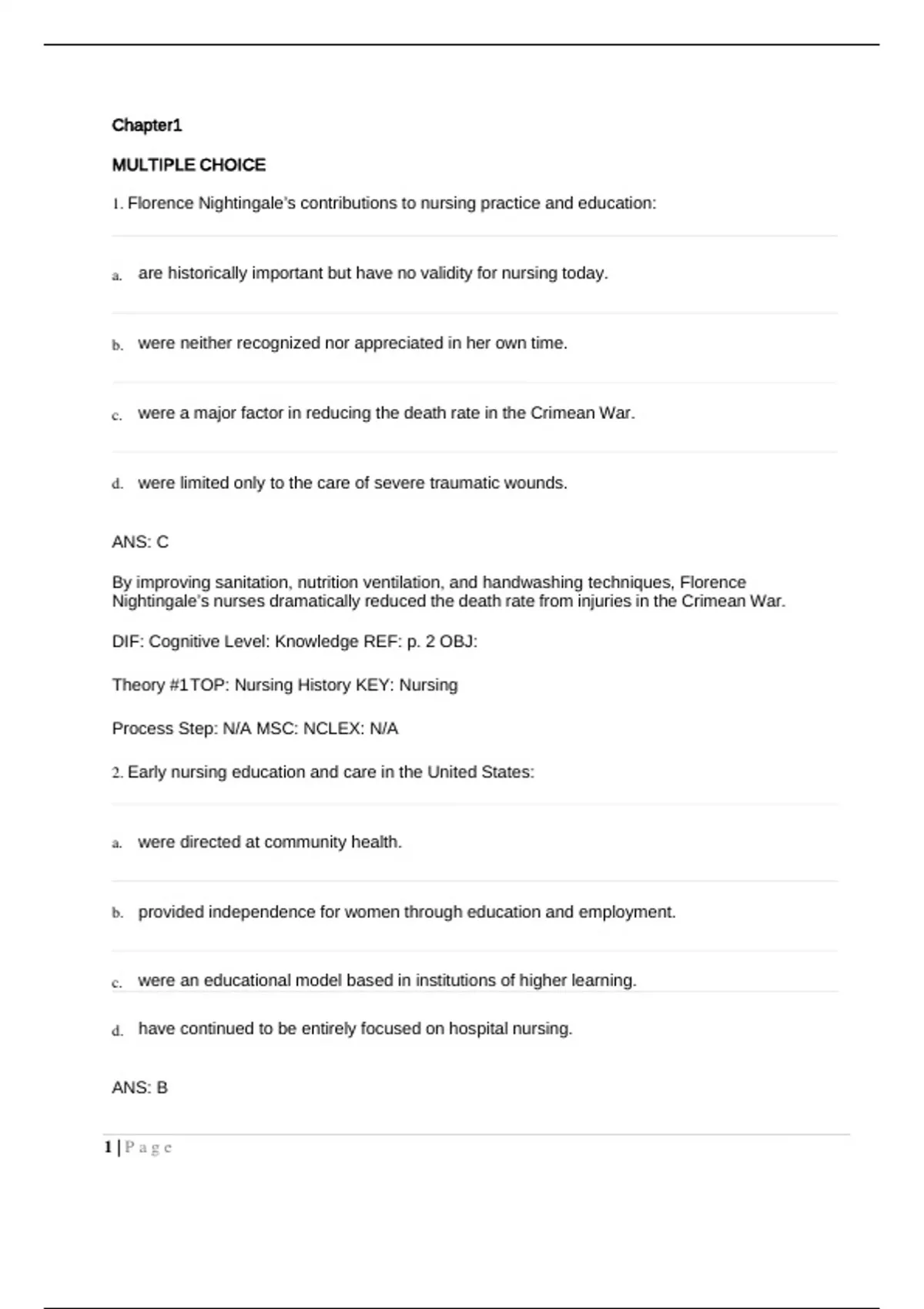 TEST BANK WILLIAMS DEWIT'S FUNDAMENTAL CONCEPTS AND SKILLS FOR NURSING 5TH EDITIONChapter1 MULTIPLE CHOICE 1. Florence Nightingale’s contributions to nursing practice and education: a. are historically important but have no validity for nursing today. b. were neither recognized nor appreciated in her own time. c. were a major factor in reducing the death rate in the Crimean War. d. were limited only to the care of severe traumatic wounds. ANS: C By improving sanitation, nutrition ventilation, and handwashing techniques, Florence Nightingale’s nurses dramatically reduced the death rate from injuries in the Crimean War. DIF: Cognitive Level: Knowledge REF: p. 2 OBJ: Theory #1 TOP: Nursing History KEY: Nursing Process Step: N/A MSC: NCLEX: N/A 2. Early nursing education and care in the United States: a. were directed at community health. b. provided independence for women through education and employment. c. were an educational model based in institutions of higher learning. d. have continued to be entirely focused on hospital nursing. ANS: B 1 | P a g eBecause of the influence of early nursing leaders, nursing education became more formalized through apprenticeships in Nightingale schools that offered independence to women through education and employment. DIF: Cognitive Level: Knowledge REF: p. 2 OBJ: Theory #4 TOP: Nursing History KEY: Nursing Process Step: N/A MSC: NCLEX: N/A 3. In order to fulfill the common goals defined by nursing theorists (promote wellness, prevent illness, facilitate coping, and restore health), the LPN must take on the roles of: a. caregiver, educator, and collaborator. b. nursing assistant, delegator, and environmental specialist. c. medication dispenser, collaborator, and transporter. d. dietitian, manager, and housekeeper. ANS: A In order for the LPN to apply the common goals of nursing, he or she must assume the roles of caregiver, educator, collaborator, manager, and advocate. DIF: Cognitive Level: Comprehension REF: p. 4 OBJ: Theory #2 TOP: Art and Science of Nursing KEY: Nursing Process Step: N/A MSC: NCLEX: N/A 4. Although nursing theories differ in their attempts to define nursing, all of them base their beliefs on common concepts concerning: a. self-actualization, fundamental needs, and belonging. b. stress reduction, self-care, and a systems model. 2 | P a g ec. curative care, restorative care, and terminal care. d. human relationships, the environment, and health. ANS: D Although nursing theories differ, they all base their beliefs on human relationships, the environment, and health. DIF: Cognitive Level: Comprehension REF: p. 4 OBJ: Theory #2 TOP: Nursing Theories KEY: Nursing Process Step: N/A MSC: NCLEX: N/A 5. Standards of care for the nursing practice of the LPN are established by the: a. Boards of Nursing Examiners in each state. b. National Council of States Boards of Nursing (NCSBN). c. American Nurses Association (ANA). d. National Federation of Licensed Practical Nurses. ANS: D The National Federation of Licensed Practical Nurses modified the standards published by the ANA in 2004 to better fit the role of the LPN. DIF: Cognitive Level: Comprehension REF: p. 5 OBJ: Theory #2 TOP: Standards of Care KEY: Nursing Process Step: N/A MSC: NCLEX: N/A 6. The LPN demonstrates an evidence-based practice by: 3 | P a g ea. using a drug manual to check compatibility of drugs. b. using scientific information to guide decision making. c. using medical history of a patient to direct nursing interventions. d. basing nursing care on advice from an experienced nurse. ANS: B The use of scientific information from high-quality research to guide nursing decisions is reflective of the application of evidence-based practice. DIF: Cognitive Level: Knowledge REF: p. 5 OBJ: Theory #3 TOP: Evidence Based Practice KEY: Nursing Process Step: N/A MSC: NCLEX: N/A 7. Lillian Wald and Mary Brewster established the Henry Street Settlement Service in New York in 1893 in order to: a. offer a shelter to injured war veterans. b. found a nursing apprenticeship. c. provide health care to poor persons living in tenements. d. offer better housing to low-income families. ANS: C Henry Street Settlement Service brought the provision of community health care to the poor people living in tenements. DIF: Cognitive Level: Comprehension REF: p. 2 OBJ: 4 | P a g eTheory #4 TOP: Growth of Nursing KEY: Nursing Process Step: N/A MSC: NCLEX: N/A 8. An educational pathway for an LPN refers to an LPN: a. learning on the job and being promoted to a higher level of responsibility. b. moving from a maternity unit to a more complicated surgical unit. c. obtaining additional education to move from one level of nursing to another. d. learning that advancement requires consistent work and commitment. ANS: C By broadening the educational base, an LPN may advance and build a nursing career. DIF: Cognitive Level: Knowledge REF: p. 6 OBJ: Theory #7 TOP: Nursing Education Pathways KEY: Nursing Process Step: N/A MSC: NCLEX: N/A 9. When diagnosis-related groups (DRGs) were established by Medicare in 1983, the purpose was to: a. put patients with the same diagnosis on the same unit. b. attempt to contain the costs of health care. c. increase availability of medical care to the elderly. d. identify a patient’s condition more quickly. 5 | P a g eANS: B The purpose of instituting DRGs was to contain skyrocketing costs of health care. DIF: Cognitive Level: Knowledge REF: p. 8 OBJ: Theory #10 TOP: Health Care Delivery KEY: Nursing Process Step: N/A MSC: NCLEX: N/A 10. The advent of diagnosis-related groups (DRGs) required that nurses working in health care agencies: record supportive documentation to confirm a patient’s need for care in order to qualify for a. reimbursement. b. use the DRG rather than their own observations for patient assessment. c. be aware of the specific drugs related to the diagnosis. d. acquire cross-training to make staffing more flexible. ANS: A DRGs required that nurses provide more s