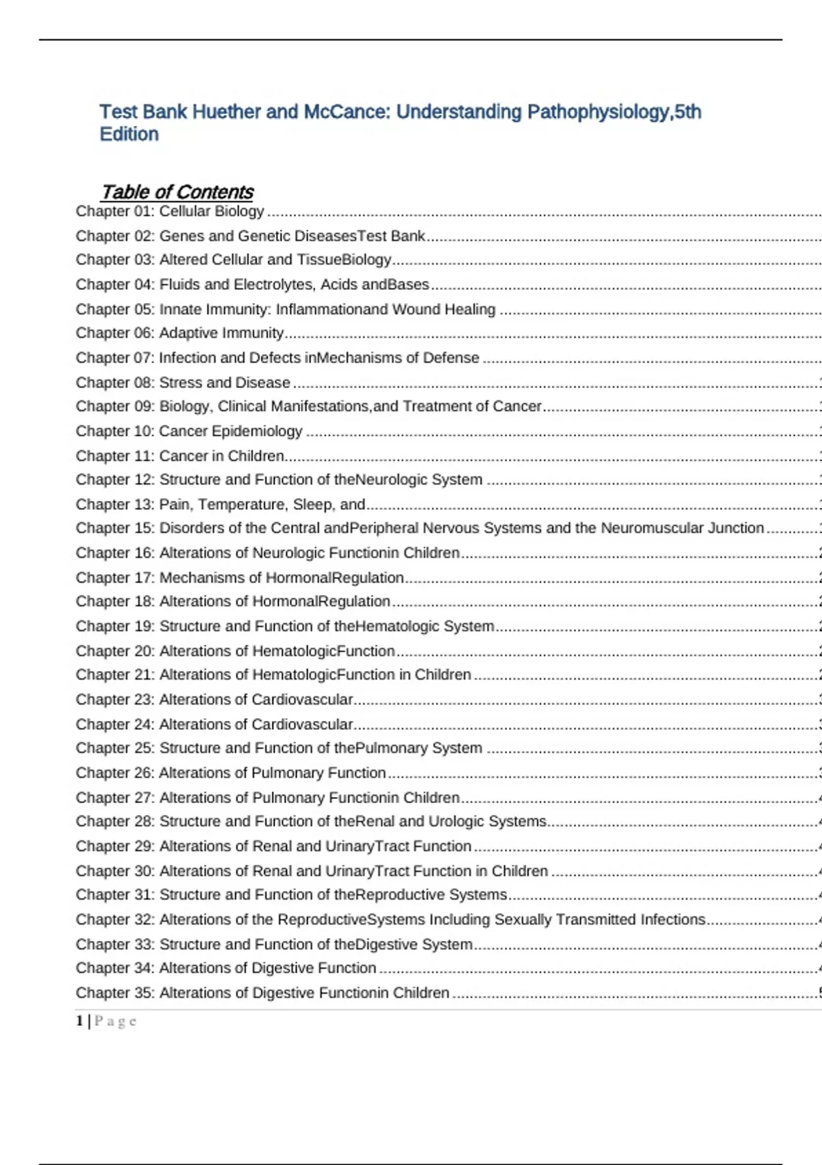 TEST BANK UNDERSTANDING PATHOPHYSIOLOGY, 5TH EDITION HUETHER AND MCCANCE Table of Contents Chapter 01: Cellular Biology .................................................................................................................................... 2 Chapter 02: Genes and Genetic Diseases Test Bank ............................................................................................. 18 Chapter 03: Altered Cellular and Tissue Biology ..................................................................................................... 31 Chapter 04: Fluids and Electrolytes, Acids and Bases ............................................................................................ 46 Chapter 05: Innate Immunity: Inflammation and Wound Healing ............................................................................ 61 Chapter 06: Adaptive Immunity .............................................................................................................................. 79 Chapter 07: Infection and Defects in Mechanisms of Defense ................................................................................ 90 Chapter 08: Stress and Disease .......................................................................................................................... 110 Chapter 09: Biology, Clinical Manifestations, and Treatment of Cancer ................................................................ 117 Chapter 10: Cancer Epidemiology ....................................................................................................................... 124 Chapter 11: Cancer in Children............................................................................................................................ 131 Chapter 12: Structure and Function of the Neurologic System ............................................................................. 135 Chapter 13: Pain, Temperature, Sleep, and ......................................................................................................... 152 Chapter 15: Disorders of the Central and Peripheral Nervous Systems and the Neuromuscular Junction ............ 183 Chapter 16: Alterations of Neurologic Function in Children ................................................................................... 205 Chapter 17: Mechanisms of Hormonal Regulation ................................................................................................ 217 Chapter 18: Alterations of Hormonal Regulation ................................................................................................... 232 Chapter 19: Structure and Function of the Hematologic System ........................................................................... 254 Chapter 20: Alterations of Hematologic Function .................................................................................................. 265 Chapter 21: Alterations of Hematologic Function in Children ................................................................................ 291 Chapter 23: Alterations of Cardiovascular ............................................................................................................ 328 Chapter 24: Alterations of Cardiovascular ............................................................................................................ 360 Chapter 25: Structure and Function of the Pulmonary System ............................................................................. 371 Chapter 26: Alterations of Pulmonary Function .................................................................................................... 384 Chapter 27: Alterations of Pulmonary Function in Children ................................................................................... 406 Chapter 28: Structure and Function of the Renal and Urologic Systems ............................................................... 418 Chapter 29: Alterations of Renal and Urinary Tract Function ................................................................................ 431 Chapter 30: Alterations of Renal and Urinary Tract Function in Children .............................................................. 445 Chapter 31: Structure and Function of the Reproductive Systems ........................................................................ 454 Chapter 32: Alterations of the Reproductive Systems Including Sexually Transmitted Infections .......................... 468 Chapter 33: Structure and Function of the Digestive System ................................................................................ 483 Chapter 34: Alterations of Digestive Function ...................................................................................................... 495 Chapter 35: Alterations of Digestive Function in Children ..................................................................................... 520 1 | P a g eChapter 36: Structure and Function of the Musculoskeletal System ..................................................................... 534 Chapter 37: Alterations of Musculoskeletal .......................................................................................................... 549 Chapter 38: Alterations of Musculoskeletal Function in Children ........................................................................... 566 Chapter 39: Structure, Function, and Disorders of the Integument ....................................................................... 575 Chapter 40: Alterations of the Integument in Children ........................................................................................... 591 Chapter 01: Cellular Biology MULTIPLE CHOICE 1. A student is observing a cell under the microscope. It is observed to have supercoiled DNA with histones. Which of the following would also be observed by the student? a. b. A single circular chromosome A nucleus ANS: B The cell described is a eukaryotic cell, so it has histones and 