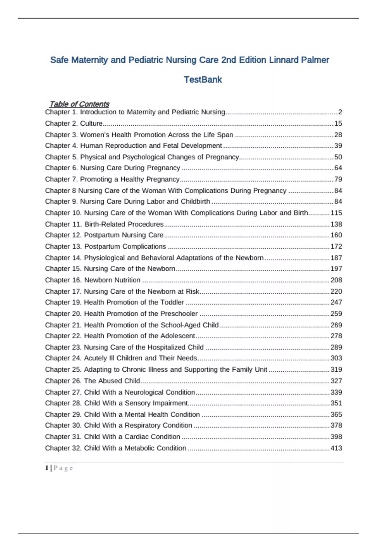 Test Bank Safe Maternity and Pediatric Nursing Care 2nd Edition Linnard-PalmerTable of Contents Chapter 1. Introduction to Maternity and Pediatric Nursing ......................................................... 2 Chapter 2. Culture ..................................................................................................................... 15 Chapter 3. Women’s Health Promotion Across the Life Span .................................................. 28 Chapter 4. Human Reproduction and Fetal Development ........................................................ 39 Chapter 5. Physical and Psychological Changes of Pregnancy ................................................ 50 Chapter 6. Nursing Care During Pregnancy ............................................................................. 64 Chapter 7. Promoting a Healthy Pregnancy .............................................................................. 79 Chapter 8 Nursing Care of the Woman With Complications During Pregnancy ....................... 84 Chapter 9. Nursing Care During Labor and Childbirth .............................................................. 84 Chapter 10. Nursing Care of the Woman With Complications During Labor and Birth ........... 115 Chapter 11. Birth-Related Procedures .................................................................................... 138 Chapter 12. Postpartum Nursing Care .................................................................................... 160 Chapter 13. Postpartum Complications .................................................................................. 172 Chapter 14. Physiological and Behavioral Adaptations of the Newborn ................................. 187 Chapter 15. Nursing Care of the Newborn .............................................................................. 197 Chapter 16. Newborn Nutrition ............................................................................................... 208 Chapter 17. Nursing Care of the Newborn at Risk .................................................................. 220 Chapter 19. Health Promotion of the Toddler ......................................................................... 247 Chapter 20. Health Promotion of the Preschooler .................................................................. 259 Chapter 21. Health Promotion of the School-Aged Child ........................................................ 269 Chapter 22. Health Promotion of the Adolescent .................................................................... 278 Chapter 23. Nursing Care of the Hospitalized Child ............................................................... 289 Chapter 24. Acutely Ill Children and Their Needs ................................................................... 303 Chapter 25. Adapting to Chronic Illness and Supporting the Family Unit ............................... 319 Chapter 26. The Abused Child ................................................................................................ 327 Chapter 27. Child With a Neurological Condition .................................................................... 339 Chapter 28. Child With a Sensory Impairment........................................................................ 351 Chapter 29. Child With a Mental Health Condition ................................................................. 365 Chapter 30. Child With a Respiratory Condition ..................................................................... 378 Chapter 31. Child With a Cardiac Condition ........................................................................... 398 Chapter 32. Child With a Metabolic Condition ........................................................................ 413 1 | P a g eChapter 33. Child With a Musculoskeletal Condition .............................................................. 422 Chapter 34. Child With a Gastrointestinal Condition ............................................................... 435 Chapter 35. Child With a Genitourinary Condition .................................................................. 453 Chapter 36. Child With a Skin Condition ................................................................................. 468 Chapter 37. Child With a Communicable Disease .................................................................. 484 Chapter 38. Child With an Oncological or Hematological Condition ....................................... 494 Chapter 1. Introduction to Maternity and Pediatric Nursing MULTIPLE CHOICE 1. A patient chooses to have the certified nurse midwife (CNM) provide care during her pregnancy. What does the CNMs scope of practice include? a. Practice independent from medical supervision b. Comprehensive prenatal care c. Attendance at all deliveries d. Cesarean sections ANS: B The CNM provides comprehensive prenatal and postnatal care, attends uncomplicated deliveries, and ensures that a backup physician is available in case of unforeseen problems. DIF: Cognitive Level: Comprehension REF: Page 6 OBJ: 12 TOP: Advance Practice Nursing Roles KEY: Nursing Process Step: Implementation MSC: NCLEX: Health Promotion and Maintenance: Prevention and Early Detection of Disease 2. Which medical pioneer discovered the relationship between the incidence of puerperal fever and unwashed hands? a. Karl Cred b. Ignaz Semmelweis c. Louis Pasteur d. Joseph Lister ANS: B Ignaz Semmelweis deduced that puerperal fever was septic, contagious, and transmitted by the unwashed hands of physicians and medical students. DIF: Cognitive Level: Knowledge REF: Page 2 OBJ: 1 TOP: The Past KEY: Nursing Process Step: N/A MSC: NCLEX: Safe, Effective Care Environment: Safety and Infection Control 2 | P a g e3. A pregnant woman who has recently immigrated to the United States comments to the nurse, I am afraid of childbirth. It is so dangerous. I am afraid I will die. What is the best nursing response reflecting cultural sensitivity