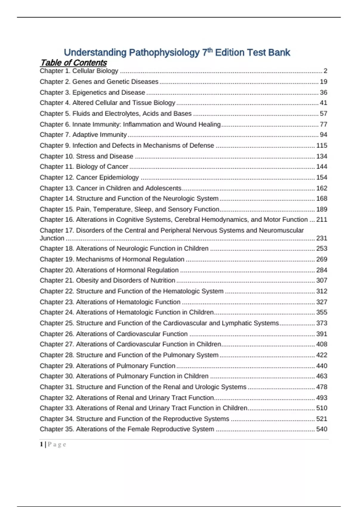 TEST BANK UNDERSTANDING PATHOPHYSIOLOGY 7TH EDITION BY SUE HUETHER AND KATHRYN MCCANCETable of Contents Chapter 1. Cellular Biology ............................................................................................................ 2 Chapter 2. Genes and Genetic Diseases ..................................................................................... 19 Chapter 3. Epigenetics and Disease ............................................................................................ 36 Chapter 4. Altered Cellular and Tissue Biology ............................................................................ 41 Chapter 5. Fluids and Electrolytes, Acids and Bases ................................................................... 57 Chapter 6. Innate Immunity: Inflammation and Wound Healing .................................................... 77 Chapter 7. Adaptive Immunity ...................................................................................................... 94 Chapter 9. Infection and Defects in Mechanisms of Defense ..................................................... 115 Chapter 10. Stress and Disease ................................................................................................ 134 Chapter 11. Biology of Cancer ................................................................................................... 144 Chapter 12. Cancer Epidemiology ............................................................................................. 154 Chapter 13. Cancer in Children and Adolescents ....................................................................... 162 Chapter 14. Structure and Function of the Neurologic System ................................................... 168 Chapter 15. Pain, Temperature, Sleep, and Sensory Function ................................................... 189 Chapter 16. Alterations in Cognitive Systems, Cerebral Hemodynamics, and Motor Function ... 211 Chapter 17. Disorders of the Central and Peripheral Nervous Systems and Neuromuscular Junction ..................................................................................................................................... 231 Chapter 18. Alterations of Neurologic Function in Children ........................................................ 253 Chapter 19. Mechanisms of Hormonal Regulation ..................................................................... 269 Chapter 20. Alterations of Hormonal Regulation ........................................................................ 284 Chapter 21. Obesity and Disorders of Nutrition .......................................................................... 307 Chapter 22. Structure and Function of the Hematologic System ................................................ 312 Chapter 23. Alterations of Hematologic Function ....................................................................... 327 Chapter 24. Alterations of Hematologic Function in Children ...................................................... 355 Chapter 25. Structure and Function of the Cardiovascular and Lymphatic Systems ................... 373 Chapter 26. Alterations of Cardiovascular Function ................................................................... 391 Chapter 27. Alterations of Cardiovascular Function in Children .................................................. 408 Chapter 28. Structure and Function of the Pulmonary System ................................................... 422 Chapter 29. Alterations of Pulmonary Function .......................................................................... 440 Chapter 30. Alterations of Pulmonary Function in Children ........................................................ 463 Chapter 31. Structure and Function of the Renal and Urologic Systems .................................... 478 Chapter 32. Alterations of Renal and Urinary Tract Function...................................................... 493 Chapter 33. Alterations of Renal and Urinary Tract Function in Children .................................... 510 Chapter 34. Structure and Function of the Reproductive Systems ............................................. 521 Chapter 35. Alterations of the Female Reproductive System ..................................................... 540 1 | P a g eChapter 36. Alterations of the Male Reproductive System ......................................................... 554 Chapter 37. Structure and Function of the Digestive System ..................................................... 564 Chapter 38. Alterations of Digestive Function ............................................................................ 580 Chapter 39. Alterations of Digestive Function in Children ........................................................... 601 Chapter 40. Structure and Function of the Musculoskeletal System ........................................... 618 Chapter 41. Alterations of Musculoskeletal Function .................................................................. 635 Chapter 42. Alterations of Musculoskeletal Function in Children ................................................ 655 Chapter 43. Structure, Function, and Disorders of the Integument ............................................. 667 Chapter 44. Alterations of the Integument in Children ................................................................ 681 Chapter 1. Cellular Biology MULTIPLE CHOICE 1. A student is observing a cell under the microscope. It is observed to have supercoiled DNA with histones. Which of the following would also be observed by the student? a. A single circular chromosome b. A nucleus c. Free-floating nuclear material d. No organelles ANS: B The cell described is a eukaryotic cell, so it has histones and a supercoiled DNA within its nucleus; thus, the nucleus should be observed. A single circular chromosome is characteristic of prokaryotic cells, which do not have histones. Free-floating nuclear material describes a 