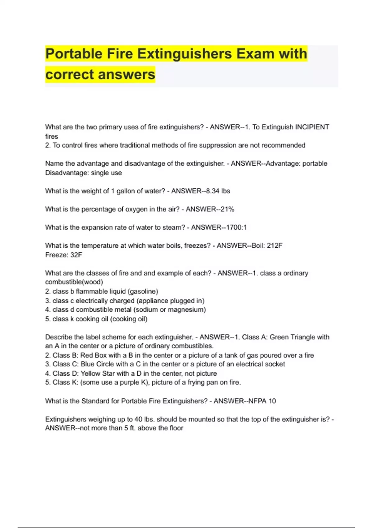 Portable Fire Extinguishers Exam with correct answers