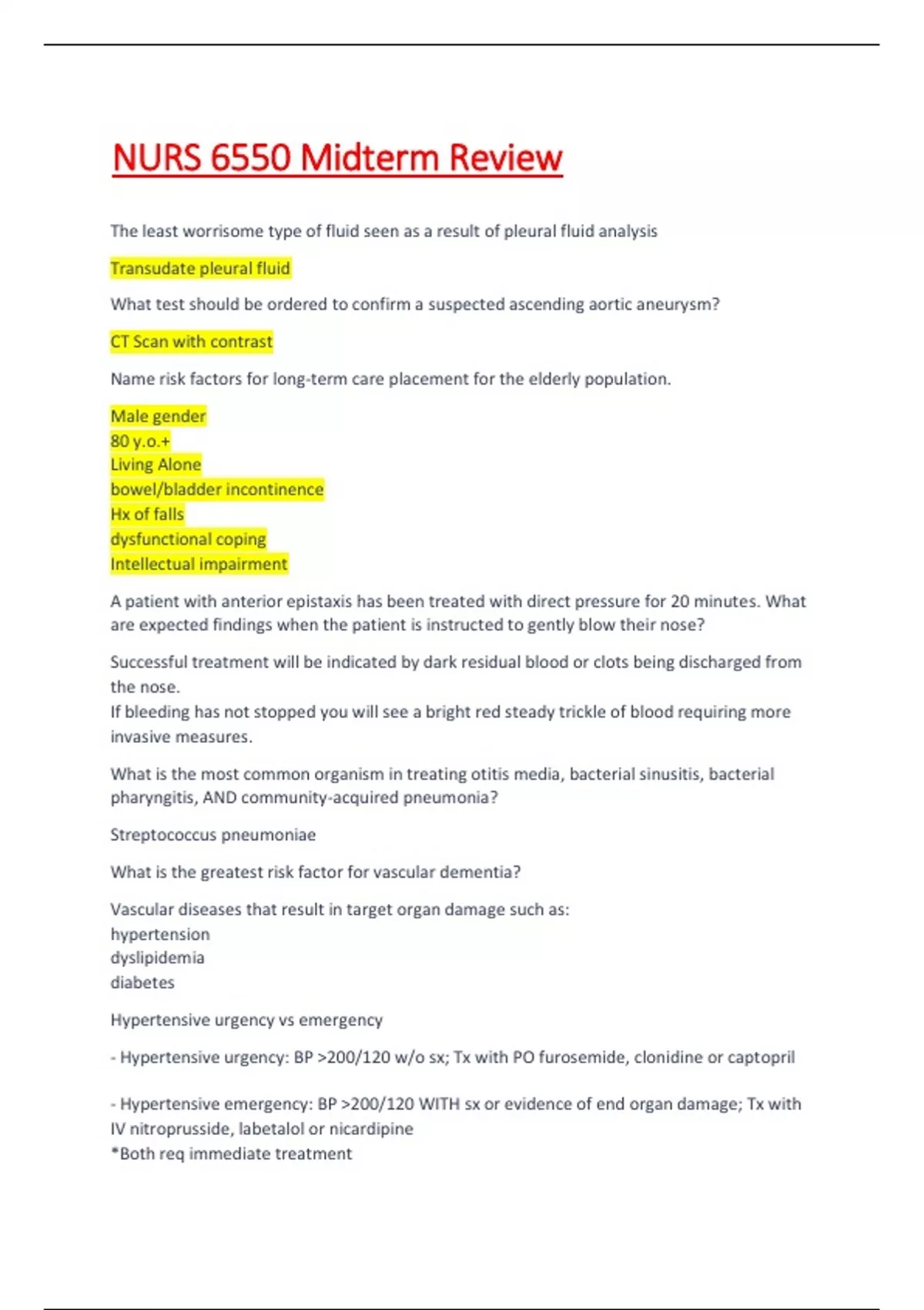 Male gender 80 y.o.+ Living Alone bowel/bladder incontinence Hx of falls dysfunctional coping Intellectual impairment A patient with anterior epistaxis has been treated with direct pressure for 20 minutes. What are expected findings when the patient is instructed to gently blow their nose? Successful treatment will be indicated by dark residual blood or clots being discharged from the nose. If bleeding has not stopped you will see a bright red steady trickle of blood requiring more invasive measures. What is the most common organism in treating otitis media, bacterial sinusitis, bacterial pharyngitis, AND community-acquired pneumonia? Streptococcus pneumoniae What is the greatest risk factor for vascular dementia? Vascular diseases that result in target organ damage such as: hypertension dyslipidemia diabetes Hypertensive urgency vs emergency - Hypertensive urgency: BP 200/120 w/o sx; Tx with PO furosemide, clonidine or captopril - Hypertensive emergency: BP 200/120 WITH sx or evidence of end organ damage; Tx with IV nitroprusside, labetalol or nicardipine *Both req immediate treatment