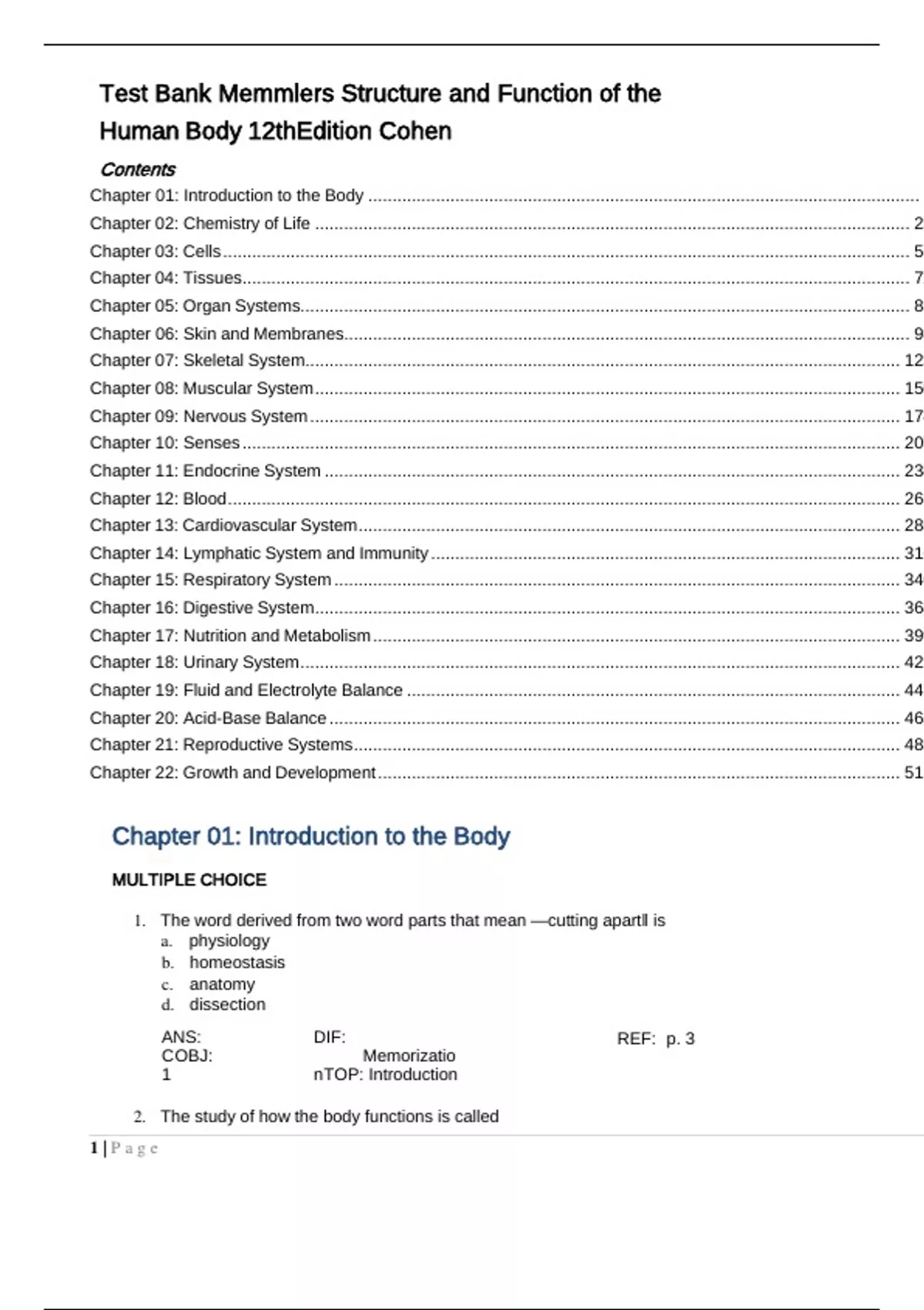 Test Bank Memmlers Structure and Function of the Human Body 12th Edition CohenContents Chapter 01: Introduction to the Body .................................................................................................................. 1 Chapter 02: Chemistry of Life ........................................................................................................................... 23 Chapter 03: Cells .............................................................................................................................................. 51 Chapter 04: Tissues .......................................................................................................................................... 72 Chapter 05: Organ Systems.............................................................................................................................. 81 Chapter 06: Skin and Membranes..................................................................................................................... 98 Chapter 07: Skeletal System ........................................................................................................................... 123 Chapter 08: Muscular System ......................................................................................................................... 150 Chapter 09: Nervous System .......................................................................................................................... 174 Chapter 10: Senses ........................................................................................................................................ 207 Chapter 11: Endocrine System ....................................................................................................................... 234 Chapter 12: Blood ........................................................................................................................................... 261 Chapter 13: Cardiovascular System ................................................................................................................ 285 Chapter 14: Lymphatic System and Immunity ................................................................................................. 316 Chapter 15: Respiratory System ..................................................................................................................... 340 Chapter 16: Digestive System ......................................................................................................................... 368 Chapter 17: Nutrition and Metabolism ............................................................................................................. 399 Chapter 18: Urinary System ............................................................................................................................ 421 Chapter 19: Fluid and Electrolyte Balance ...................................................................................................... 447 Chapter 20: Acid-Base Balance ...................................................................................................................... 465 Chapter 21: Reproductive Systems ................................................................................................................. 483 Chapter 22: Growth and Development ............................................................................................................ 511 Chapter 01: Introduction to the Body MULTIPLE CHOICE 1. The word derived from two word parts that mean ―cutting apart‖ is a. physiology b. homeostasis c. anatomy d. dissection ANS: C OBJ: 1 DIF: Memorizatio n TOP: Introduction 2. The study of how the body functions is called 1 | P a g e REF: p. 3a. physiology b. homeostasis c. anatomy d. dissection ANS: A OBJ: 1 DIF: Memorizatio n TOP: Introduction 3. The correct sequence of the level of organization is a. cellular, chemical, tissue, organ b. chemical, cellular, tissue, organ c. chemical, cellular, organ, tissue d. chemical, tissue, cellular, organ ANS: B OBJ: 3 DIF: Memorization TOP: Structural levels of organization 4. The smallest living unit of structure is considered to be at the a. chemical level b. cellular level c. organ level d. tissue level ANS: B OBJ: 3 DIF: Memorization TOP: Structural levels of organization 5. The reference position for all body directional terms is the a. anatomical position b. prone position c. supine position d. sitting position ANS: A OBJ: 4 DIF: Memorization TOP: Anatomical position 6. The relationship between the knee and the ankle can be described as a. the knee is inferior to the ankle b. the knee is distal to the ankle c. the knee is proximal to the ankle d. both a and b above ANS: C DIF: Application REF: pp. 7-8 5 TOP: Anatomical directions 7. The relationship between the heart and the lungs can be described as a. the heart is distal to the lungs b. the heart is medial to the lungs c. the heart is lateral to the lungs d. both a and c above 2 | P a g e OBJ: REF: pp. 6- 7 REF: p. 6 REF: p. 5 REF: p. 3ANS: B DIF: Application REF: p. 7 5 TOP: Anatomical directions 8. The term most opposite proximal is a. medial b. superior c. anterior d. distal ANS: D 7 OBJ: 5 DIF: Memorization TOP: Anatomical directions 9. Because humans walk in an upright position, the two terms that can be used interchangeably are a. posterior and ventral b. posterior and inferior c. posterior and superficial d. posterior and dorsal ANS: D 7 OBJ: 5 DIF: Memorization TOP: Anatomical directions 10. The term most opposite medial is a. dorsal b. lateral c. superficial d. none of the above ANS: B 7 OBJ: 5 DIF: Memorization TOP: Anatomical directions 11. The relationship between the skin and the muscles can be described as a. the skin is superficial to the muscle b. the muscle is superficial to the skin c. the muscle is deep to the skin d. both a and c above ANS: D 7 OBJ: 3 DIF: Memorization TOP: Anatomical directions 12. 