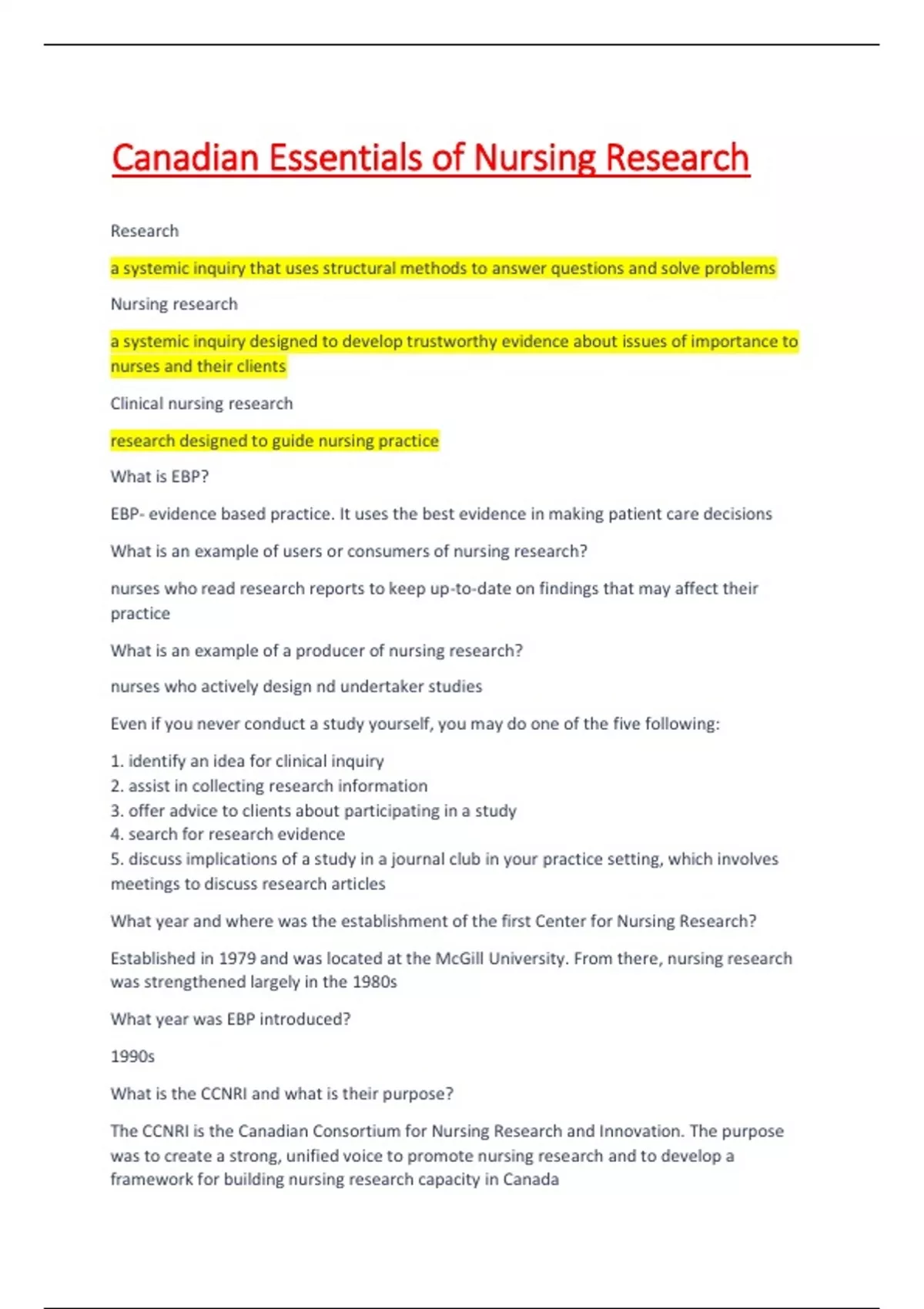 esearch designed to guide nursing practice What is EBP? EBP- evidence based practice. It uses the best evidence in making patient care decisions What is an example of users or consumers of nursing research? nurses who read research reports to keep up-to-date on findings that may affect their practice What is an example of a producer of nursing research? nurses who actively design nd undertaker studies Even if you never conduct a study yourself, you may do one of the five following: 1. identify an idea for clinical inquiry 2. assist in collecting research information 3. offer advice to clients about participating in a study 4. search for research evidence 5. discuss implications of a study in a journal club in your practice setting, which involves meetings to discuss research articles What year and where was the establishment of the first Center for Nursing Research? Established in 1979 and was located at the McGill University. From there, nursing research was strengthened largely in the 1980s What year was EBP introduced? 1990s What is the CCNRI and what is their purpose? The CCNRI is the Canadian Consortium for Nursing Research and Innovation. The purpose was to create a strong, unified voice to promote nursing research and to develop a framework for building nursing research capacity in Canada