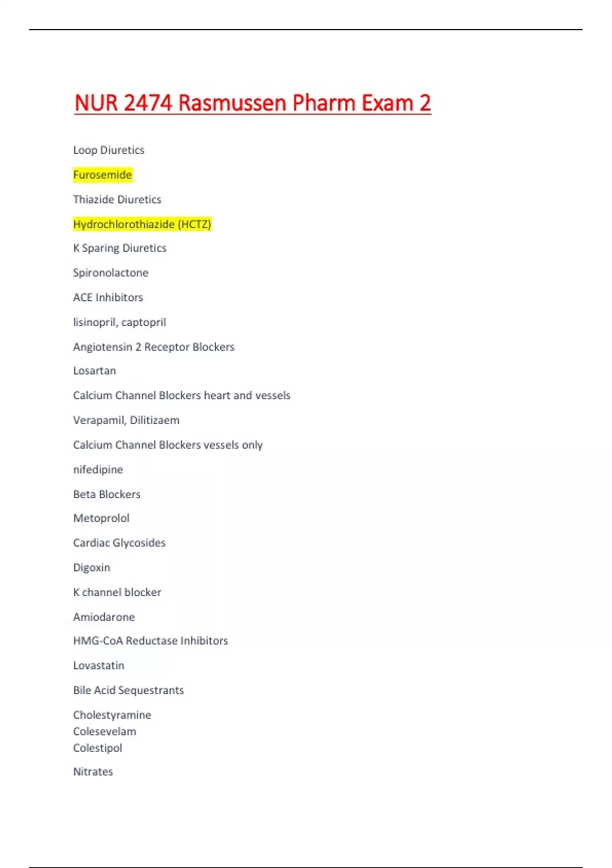 Calcium Channel Blockers heart and vessels Verapamil, Dilitizaem Calcium Channel Blockers vessels only nifedipine Beta Blockers Metoprolol Cardiac Glycosides Digoxin K channel blocker Amiodarone HMG-CoA Reductase Inhibitors Lovastatin Bile Acid Sequestrants Cholestyramine Colesevelam Colestipol Nitrates