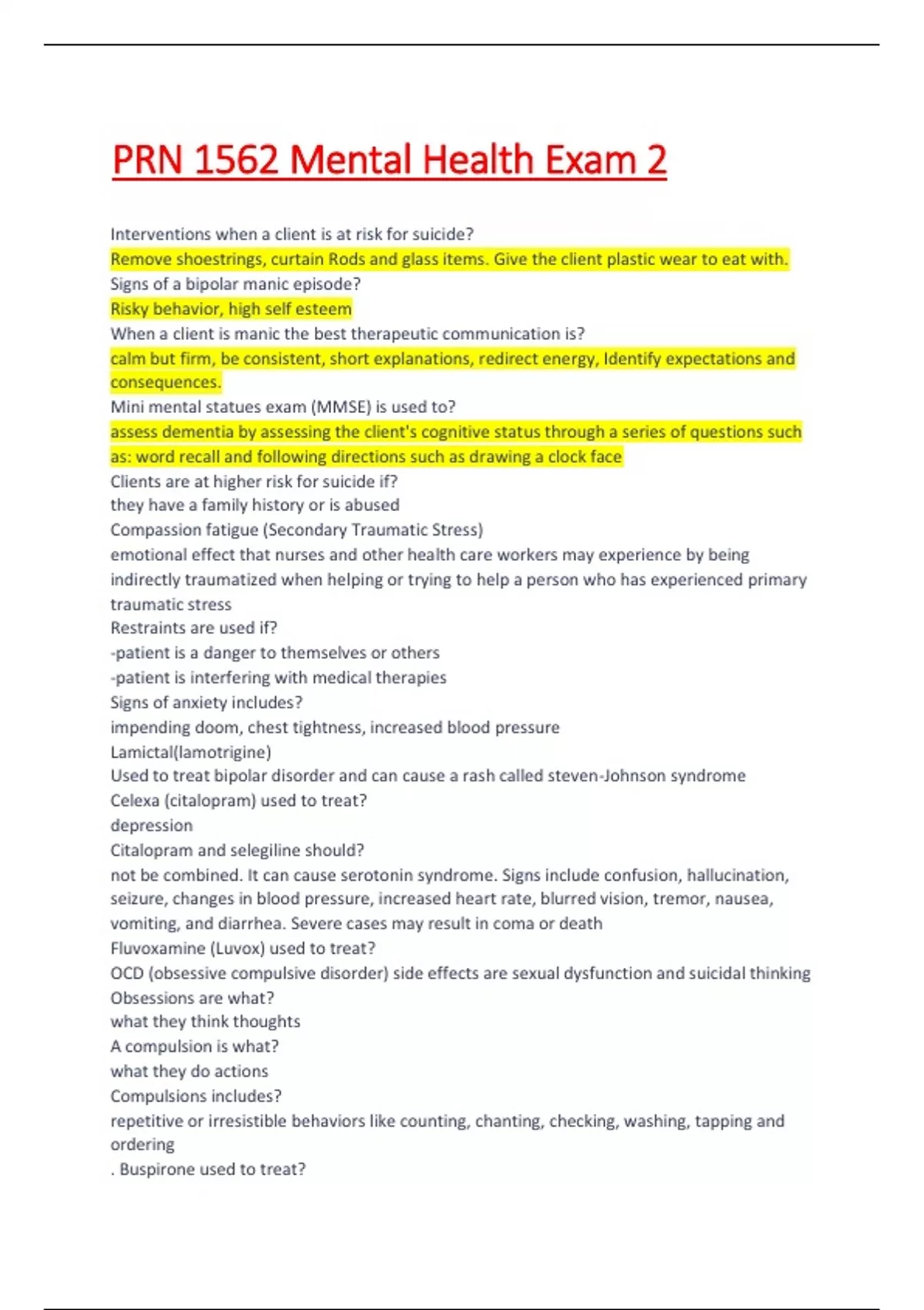 Clients are at higher risk for suicide if? they have a family history or is abused Compassion fatigue (Secondary Traumatic Stress) emotional effect that nurses and other health care workers may experience by being indirectly traumatized when helping or trying to help a person who has experienced primary traumatic stress Restraints are used if? -patient is a danger to themselves or others -patient is interfering with medical therapies Signs of anxiety includes? impending doom, chest tightness, increased blood pressure Lamictal(lamotrigine) Used to treat bipolar disorder and can cause a rash called steven-Johnson syndrome Celexa (citalopram) used to treat? depression Citalopram and selegiline should? not be combined. It can cause serotonin syndrome. Signs include confusion, hallucination, seizure, changes in blood pressure, increased heart rate, blurred vision, tremor, nausea, vomiting, and diarrhea. Severe cases may result in coma or death Fluvoxamine (Luvox) used to treat? OCD (obsessive compulsive disorder) side effects are sexual dysfunction and suicidal thinking Obsessions are what? what they think thoughts A compulsion is what? what they do actions Compulsions includes? repetitive or irresistible behaviors like counting, chanting, checking, washing, tapping and ordering . Buspirone used to treat?
