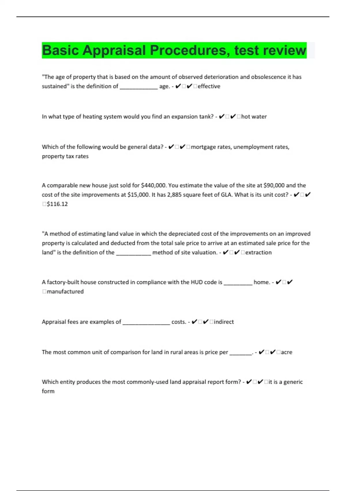 "The age of property that is based on the amount of observed deterioration and obsolescence it has sustained" is the definition of ____________ age. - ️️effective In what type of heating system would you find an expansion tank? - ️️hot water Which of the following would be general data? - ️️mortgage rates, unemployment rates, property tax rates A comparable new house just sold for $440,000. You estimate the value of the site at $90,000 and the cost of the site improvements at $15,000. It has 2,885 square feet of GLA. What is its unit cost? - ️️$116.12 "A method of estimating land value in which the depreciated cost of the improvements on an improved property is calculated and deducted from the total sale price to arrive at an estimated sale price for the land" is the definition of the ___________ method of site valuation. - ️️extraction A factory-built house constructed in compliance with the HUD code is _________ home. - ️️manufactured Appraisal fees are examples of _______________ costs. - ️️indirect The most common unit of comparison for land in rural areas is price per _______. - ️️acre Which entity produces the most commonly-used land appraisal report form? - ️️it is a generic form