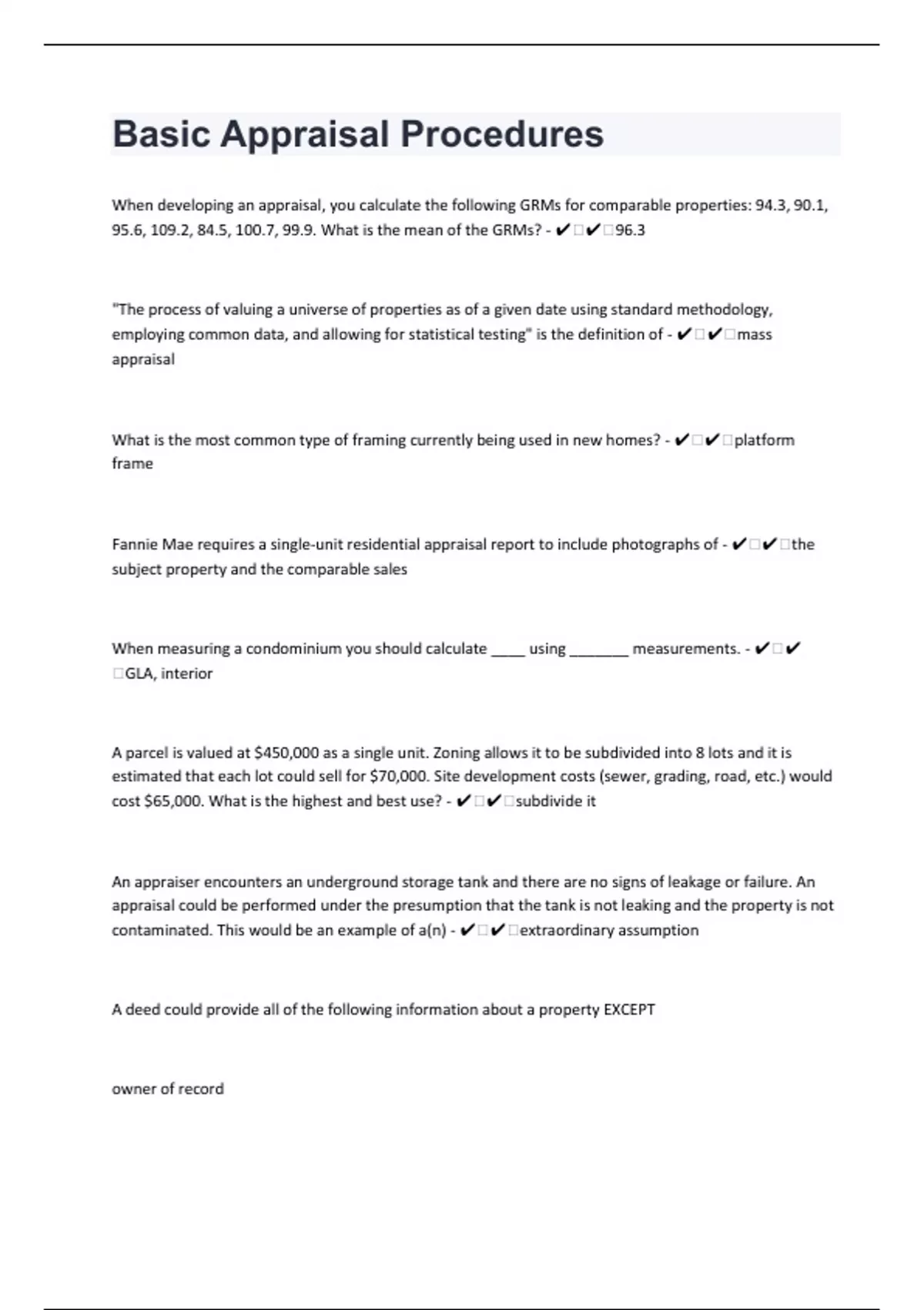 When developing an appraisal, you calculate the following GRMs for comparable properties: 94.3, 90.1, 95.6, 109.2, 84.5, 100.7, 99.9. What is the mean of the GRMs? - ️️96.3 "The process of valuing a universe of properties as of a given date using standard methodology, employing common data, and allowing for statistical testing" is the definition of - ️️mass appraisal What is the most common type of framing currently being used in new homes? - ️️platform frame Fannie Mae requires a single-unit residential appraisal report to include photographs of - ️️the subject property and the comparable sales When measuring a condominium you should calculate ____ using _______ measurements. - ️️GLA, interior A parcel is valued at $450,000 as a single unit. Zoning allows it to be subdivided into 8 lots and it is estimated that each lot could sell for $70,000. Site development costs (sewer, grading, road, etc.) would cost $65,000. What is the highest and best use? - ️️subdivide it An appraiser encounters an underground storage tank and there are no signs of leakage or failure. An appraisal could be performed under the presumption that the tank is not leaking and the property is not contaminated. This would be an example of a(n) - ️️extraordinary assumption A deed could provide all of the following information about a property EXCEPT owner of record easements deed restrictions zoning - ️️zoning