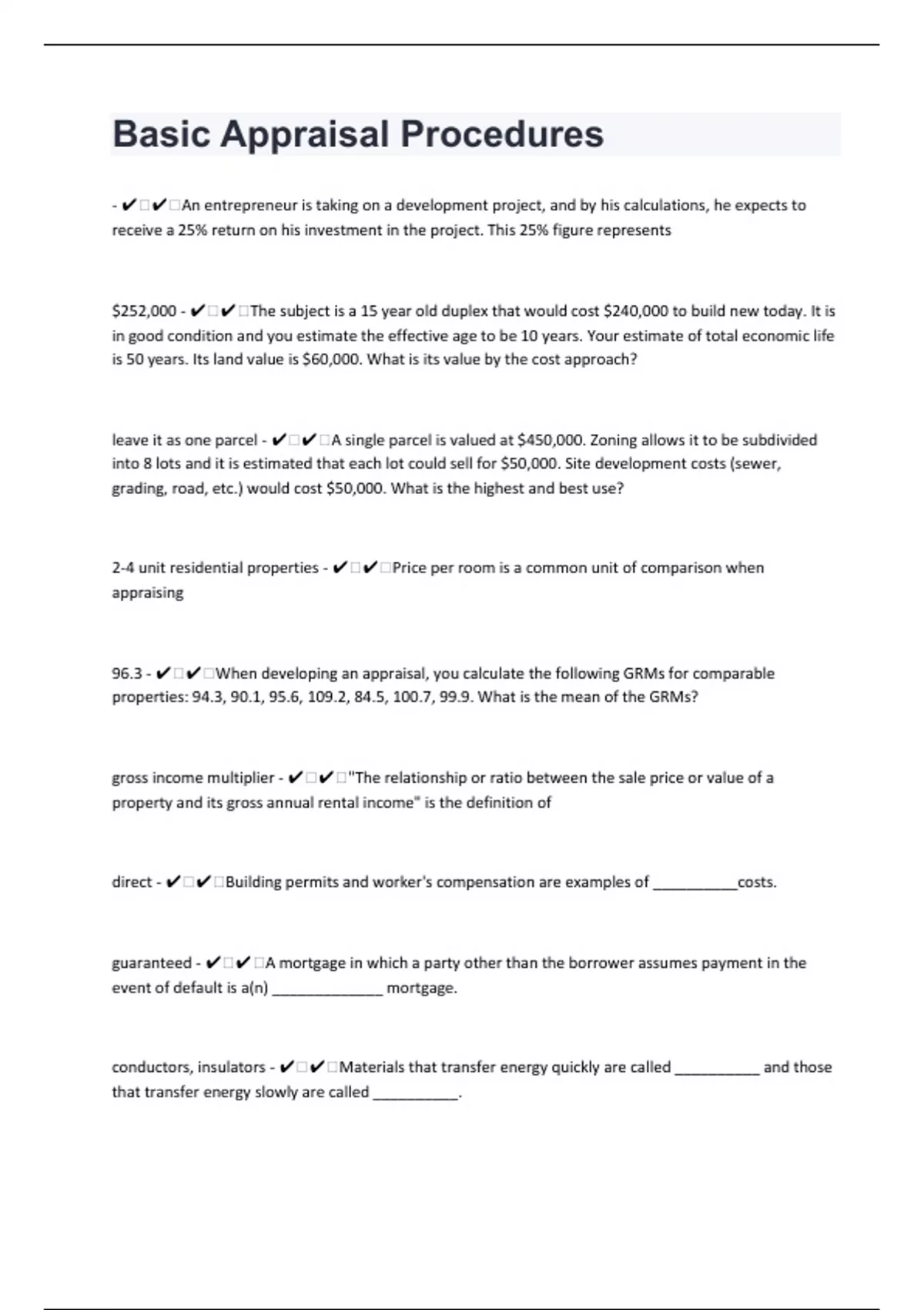 - ️️An entrepreneur is taking on a development project, and by his calculations, he expects to receive a 25% return on his investment in the project. This 25% figure represents $252,000 - ️️The subject is a 15 year old duplex that would cost $240,000 to build new today. It is in good condition and you estimate the effective age to be 10 years. Your estimate of total economic life is 50 years. Its land value is $60,000. What is its value by the cost approach? leave it as one parcel - ️️A single parcel is valued at $450,000. Zoning allows it to be subdivided into 8 lots and it is estimated that each lot could sell for $50,000. Site development costs (sewer, grading, road, etc.) would cost $50,000. What is the highest and best use? 2-4 unit residential properties - ️️Price per room is a common unit of comparison when appraising 96.3 - ️️When developing an appraisal, you calculate the following GRMs for comparable properties: 94.3, 90.1, 95.6, 109.2, 84.5, 100.7, 99.9. What is the mean of the GRMs? gross income multiplier - ️️"The relationship or ratio between the sale price or value of a property and its gross annual rental income" is the definition of direct - ️️Building permits and worker's compensation are examples of __________costs. guaranteed - ️️A mortgage in which a party other than the borrower assumes payment in the event of default is a(n) _____________ mortgage. conductors, insulators - ️️Materials that transfer energy quickly are called __________ and those that transfer energy slowly are called __________.