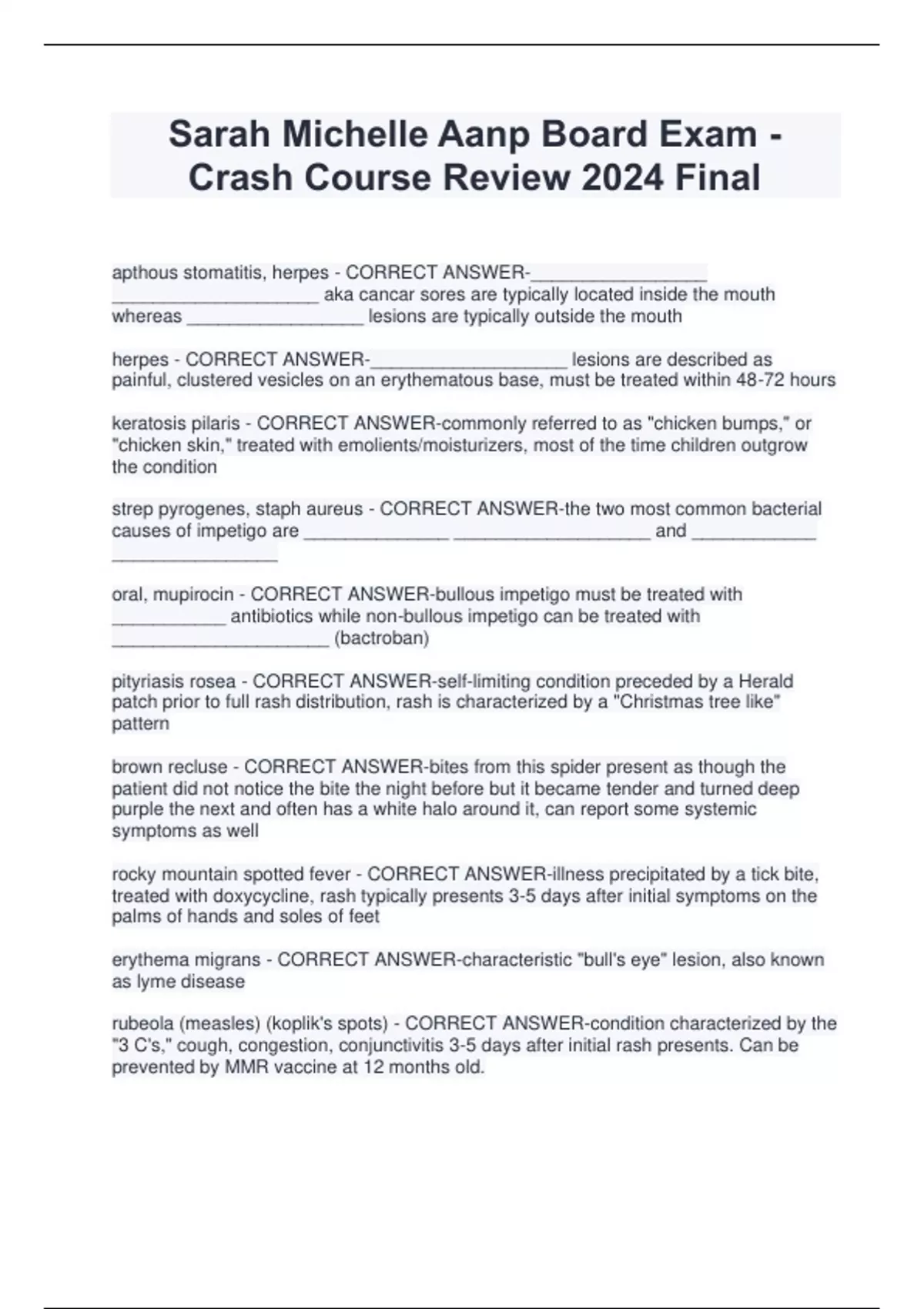 Sarah Michelle Aanp Board Exam - Crash Course Review 2024 Final apthous stomatitis, herpes - CORRECT ANSWER-_________________ ____________________ aka cancar sores are typically located inside the mouth whereas _________________ lesions are typically outside the mouth herpes - CORRECT ANSWER-___________________ lesions are described as painful, clustered vesicles on an erythematous base, must be treated within 48-72 hours keratosis pilaris - CORRECT ANSWER-commonly referred to as "chicken bumps," or "chicken skin," treated with emolients/moisturizers, most of the time children outgrow the condition strep pyrogenes, staph aureus - CORRECT ANSWER-the two most common bacterial causes of impetigo are ______________ ___________________ and ____________ ________________ oral, mupirocin - CORRECT ANSWER-bullous impetigo must be treated with ___________ antibiotics while non-bullous impetigo can be treated with _____________________ (bactroban) pityriasis rosea - CORRECT ANSWER-self-limiting condition preceded by a Herald patch prior to full rash distribution, rash is characterized by a "Christmas tree like" pattern brown recluse - CORRECT ANSWER-bites from this spider present as though the patient did not notice the bite the night before but it became tender and turned deep purple the next and often has a white halo around it, can report some systemic symptoms as well rocky mountain spotted fever - CORRECT ANSWER-illness precipitated by a tick bite, treated with doxycycline, rash typically presents 3-5 days after initial symptoms on the palms of hands and soles of feet erythema migrans - CORRECT ANSWER-characteristic "bull's eye" lesion, also known as lyme disease rubeola (measles) (koplik's spots) - CORRECT ANSWER-condition characterized by the "3 C's," cough, congestion, conjunctivitis 3-5 days after initial rash presents. Can be prevented by MMR vaccine at 12 months old. mumps - CORRECT ANSWER-most common symptom of this condition is parotid gland swelling actinic keratosis - CORRECT ANSWER-skin lesion characterized by dry pink lesions on a sun exposed area, if left untreated can lead to cancer, specifically squamous cell carcinoma squamous cell carcinoma - CORRECT ANSWER-skin cancer characterized by slow growth, scaly, ulcerated appearance, bleeds easily cafe au lait spots - CORRECT ANSWER-hyperpigmentation of the skin, typically benign and does not require further intervention, however if a patient has more than 8 of them it may indicate underlying disorder such as neurofibromatosis melanoma - CORRECT ANSWER-the "ABCDE" tool is used to evaluate a lesion that you suspect may be malignant ___________________, A= asymmetry, B= border, C= color, D= diameter, E= evolving/elevated eczema (atopic dermatitis) - CORRECT ANSWER-skin condition characterized by intensely pruritic itch/scratch cycle, typically located on flexor surfaces of the body emollients, steroids - CORRECT ANSWER-eczema (atopic dermatitis) is often associated with allergies and asthma and is treated with _____________________ and topical ________________ plaque psoriasis - CORRECT ANSWER-skin condition characterized by thick silvery scales, it is treated with topical steroids or coal tar Auspitz sign - CORRECT ANSWER-when psoriasis plaques are scratched and pinpoint bleeding occurs Koebner's phenomenon - CORRECT ANSWER-when there is trauma to the skin that leads to plaque psoriasis formation shingles - CORRECT ANSWER-___________________ rash is typically across a dermatome, vesicular in nature and usually preceded by burning and tingling at the site before the rash appears contact dermatitis - CORRECT ANSWER-rash that is localized and linear and related to an irritant, usually occurs immediately shingrix - CORRECT ANSWER-shingles vaccine that can be given no matter when the last shingles outbreak was, it is inactivated, can be given starting at age 50 scabies - CORRECT ANSWER-intensely pruritic skin condition commonly seen between the fingers and toes, other members of the household typically have it as well
