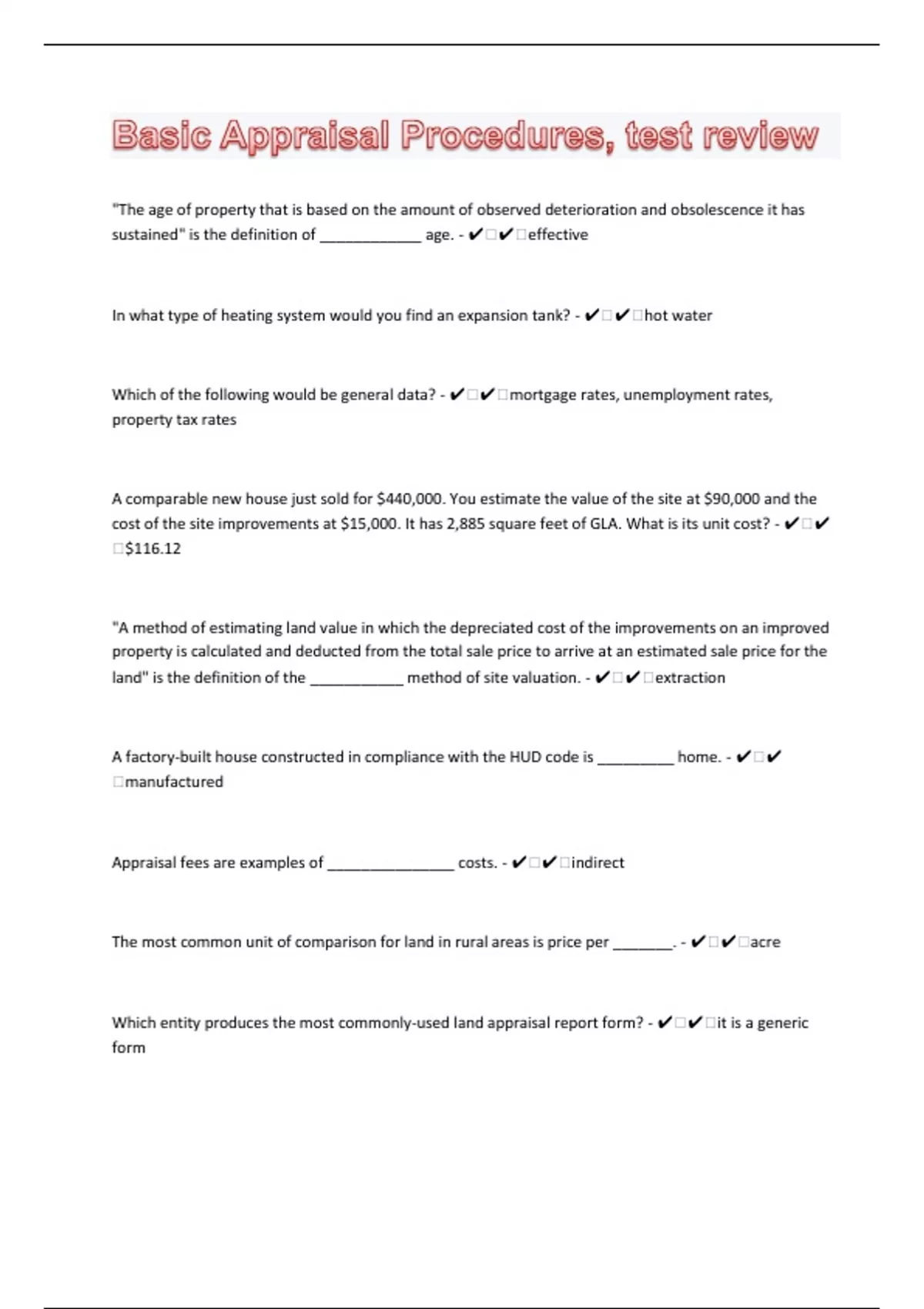"The age of property that is based on the amount of observed deterioration and obsolescence it has sustained" is the definition of ____________ age. - ️️effective In what type of heating system would you find an expansion tank? - ️️hot water Which of the following would be general data? - ️️mortgage rates, unemployment rates, property tax rates A comparable new house just sold for $440,000. You estimate the value of the site at $90,000 and the cost of the site improvements at $15,000. It has 2,885 square feet of GLA. What is its unit cost? - ️️$116.12 "A method of estimating land value in which the depreciated cost of the improvements on an improved property is calculated and deducted from the total sale price to arrive at an estimated sale price for the land" is the definition of the ___________ method of site valuation. - ️️extraction A factory-built house constructed in compliance with the HUD code is _________ home. - ️️manufactured Appraisal fees are examples of _______________ costs. - ️️indirect The most common unit of comparison for land in rural areas is price per _______. - ️️acre Which entity produces the most commonly-used land appraisal report form? - ️️it is a generic form