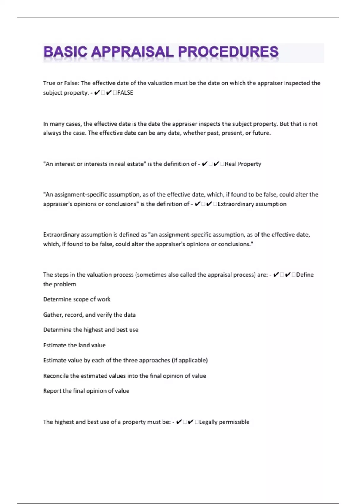 True or False: The effective date of the valuation must be the date on which the appraiser inspected the subject property. - ️️FALSE In many cases, the effective date is the date the appraiser inspects the subject property. But that is not always the case. The effective date can be any date, whether past, present, or future. "An interest or interests in real estate" is the definition of - ️️Real Property "An assignment-specific assumption, as of the effective date, which, if found to be false, could alter the appraiser's opinions or conclusions" is the definition of - ️️Extraordinary assumption Extraordinary assumption is defined as "an assignment-specific assumption, as of the effective date, which, if found to be false, could alter the appraiser's opinions or conclusions." The steps in the valuation process (sometimes also called the appraisal process) are: - ️️Define the problem Determine scope of work Gather, record, and verify the data Determine the highest and best use Estimate the land value Estimate value by each of the three approaches (if applicable) Reconcile the estimated values into the final opinion of value Report the final opinion of value The highest and best use of a property must be: - ️️Legally permissible
