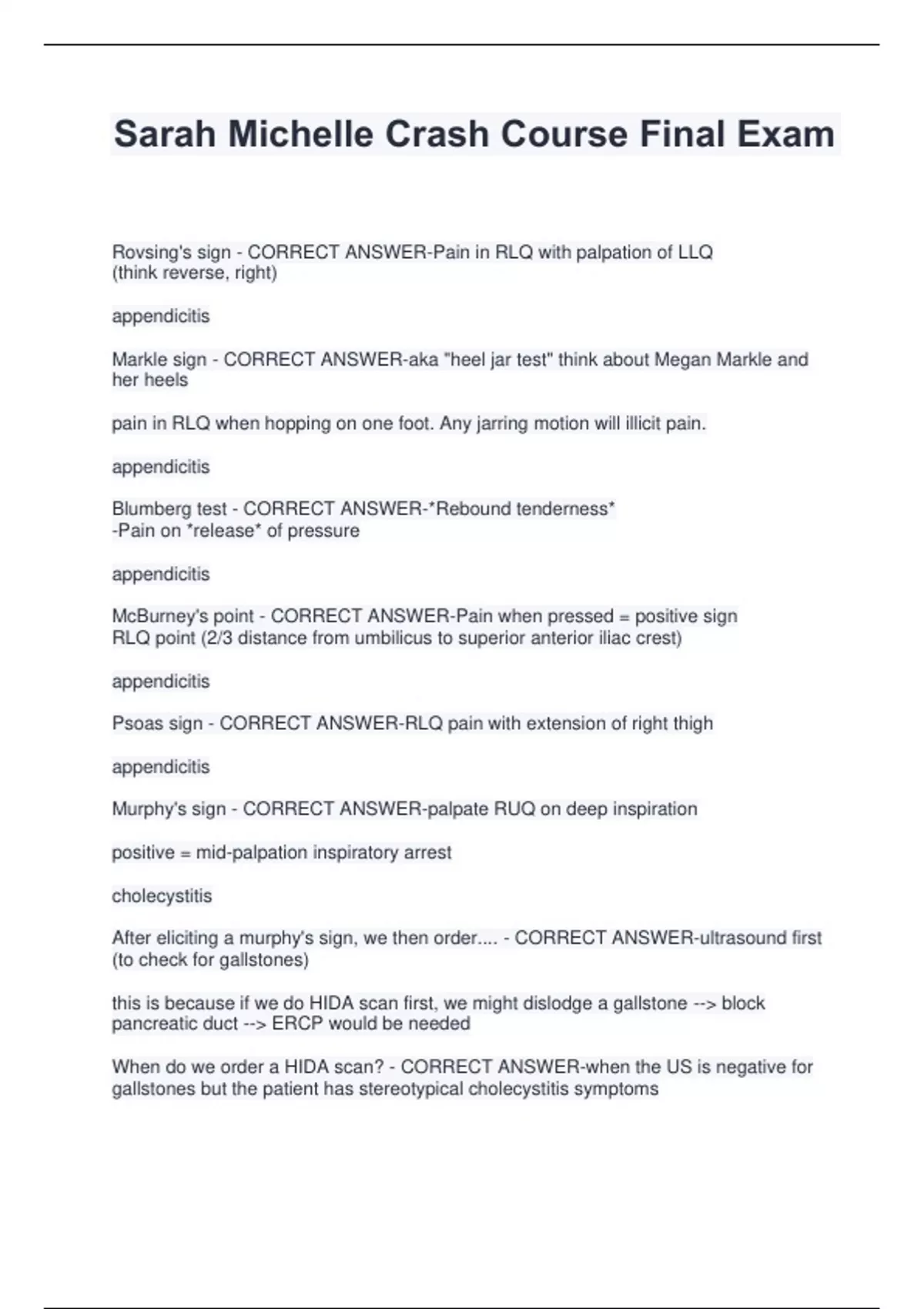 Sarah Michelle Crash Course Final Exam Rovsing's sign - CORRECT ANSWER-Pain in RLQ with palpation of LLQ (think reverse, right) appendicitis Markle sign - CORRECT ANSWER-aka "heel jar test" think about Megan Markle and her heels pain in RLQ when hopping on one foot. Any jarring motion will illicit pain. appendicitis Blumberg test - CORRECT ANSWER-*Rebound tenderness* -Pain on *release* of pressure appendicitis McBurney's point - CORRECT ANSWER-Pain when pressed = positive sign RLQ point (2/3 distance from umbilicus to superior anterior iliac crest) appendicitis Psoas sign - CORRECT ANSWER-RLQ pain with extension of right thigh appendicitis Murphy's sign - CORRECT ANSWER-palpate RUQ on deep inspiration positive = mid-palpation inspiratory arrest cholecystitis After eliciting a murphy's sign, we then order.... - CORRECT ANSWER-ultrasound first (to check for gallstones) this is because if we do HIDA scan first, we might dislodge a gallstone --> block pancreatic duct --> ERCP would be needed When do we order a HIDA scan? - CORRECT ANSWER-when the US is negative for gallstones but the patient has stereotypical cholecystitis symptoms