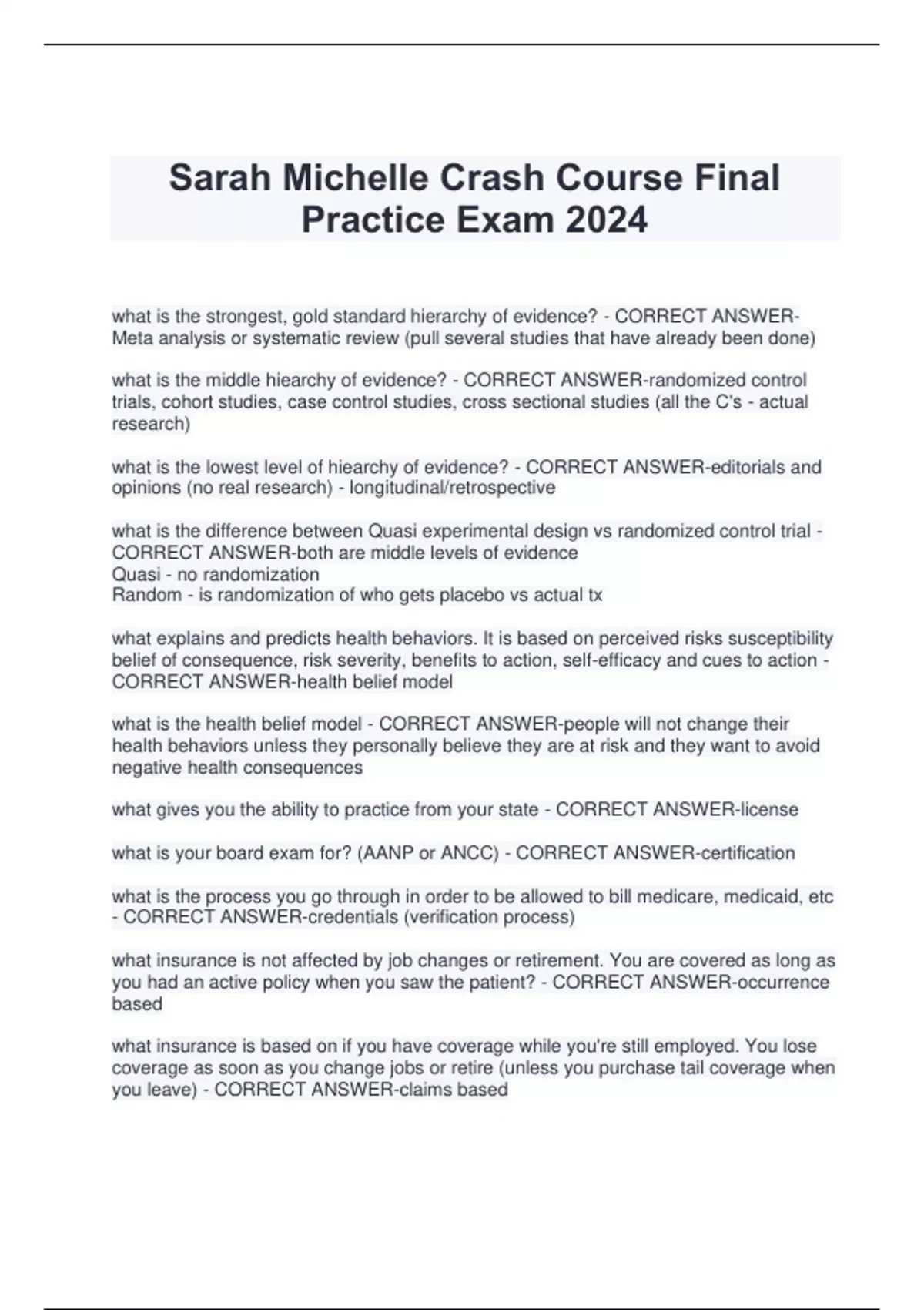 Sarah Michelle Crash Course Final Practice Exam 2024 what is the strongest, gold standard hierarchy of evidence? - CORRECT ANSWERMeta analysis or systematic review (pull several studies that have already been done) what is the middle hiearchy of evidence? - CORRECT ANSWER-randomized control trials, cohort studies, case control studies, cross sectional studies (all the C's - actual research) what is the lowest level of hiearchy of evidence? - CORRECT ANSWER-editorials and opinions (no real research) - longitudinal/retrospective what is the difference between Quasi experimental design vs randomized control trial - CORRECT ANSWER-both are middle levels of evidence Quasi - no randomization Random - is randomization of who gets placebo vs actual tx what explains and predicts health behaviors. It is based on perceived risks susceptibility belief of consequence, risk severity, benefits to action, self-efficacy and cues to action - CORRECT ANSWER-health belief model what is the health belief model - CORRECT ANSWER-people will not change their health behaviors unless they personally believe they are at risk and they want to avoid negative health consequences what gives you the ability to practice from your state - CORRECT ANSWER-license what is your board exam for? (AANP or ANCC) - CORRECT ANSWER-certification what is the process you go through in order to be allowed to bill medicare, medicaid, etc - CORRECT ANSWER-credentials (verification process) what insurance is not affected by job changes or retirement. You are covered as long as you had an active policy when you saw the patient? - CORRECT ANSWER-occurrence based what insurance is based on if you have coverage while you're still employed. You lose coverage as soon as you change jobs or retire (unless you purchase tail coverage when you leave) - CORRECT ANSWER-claims based