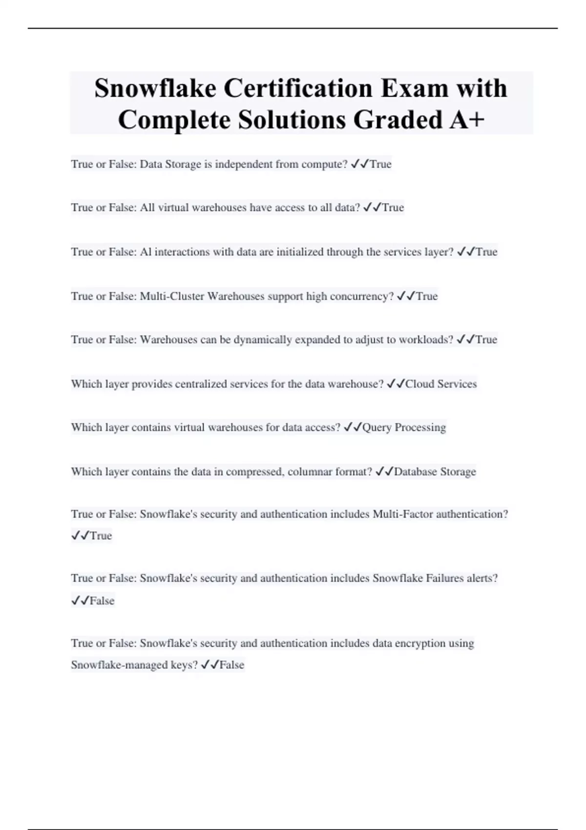 Snowflake Certification Exam with Complete Solutions Graded A+ True or False: Data Storage is independent from compute? True True or False: All virtual warehouses have access to all data? True True or False: Al interactions with data are initialized through the services layer? True True or False: Multi-Cluster Warehouses support high concurrency? True True or False: Warehouses can be dynamically expanded to adjust to workloads? True Which layer provides centralized services for the data warehouse? Cloud Services Which layer contains virtual warehouses for data access? Query Processing Which layer contains the data in compressed, columnar format? Database Storage True or False: Snowflake's security and authentication includes Multi-Factor authentication? True True or False: Snowflake's security and authentication includes Snowflake Failures alerts? False True or False: Snowflake's security and authentication includes data encryption using Snowflake-managed keys? False
