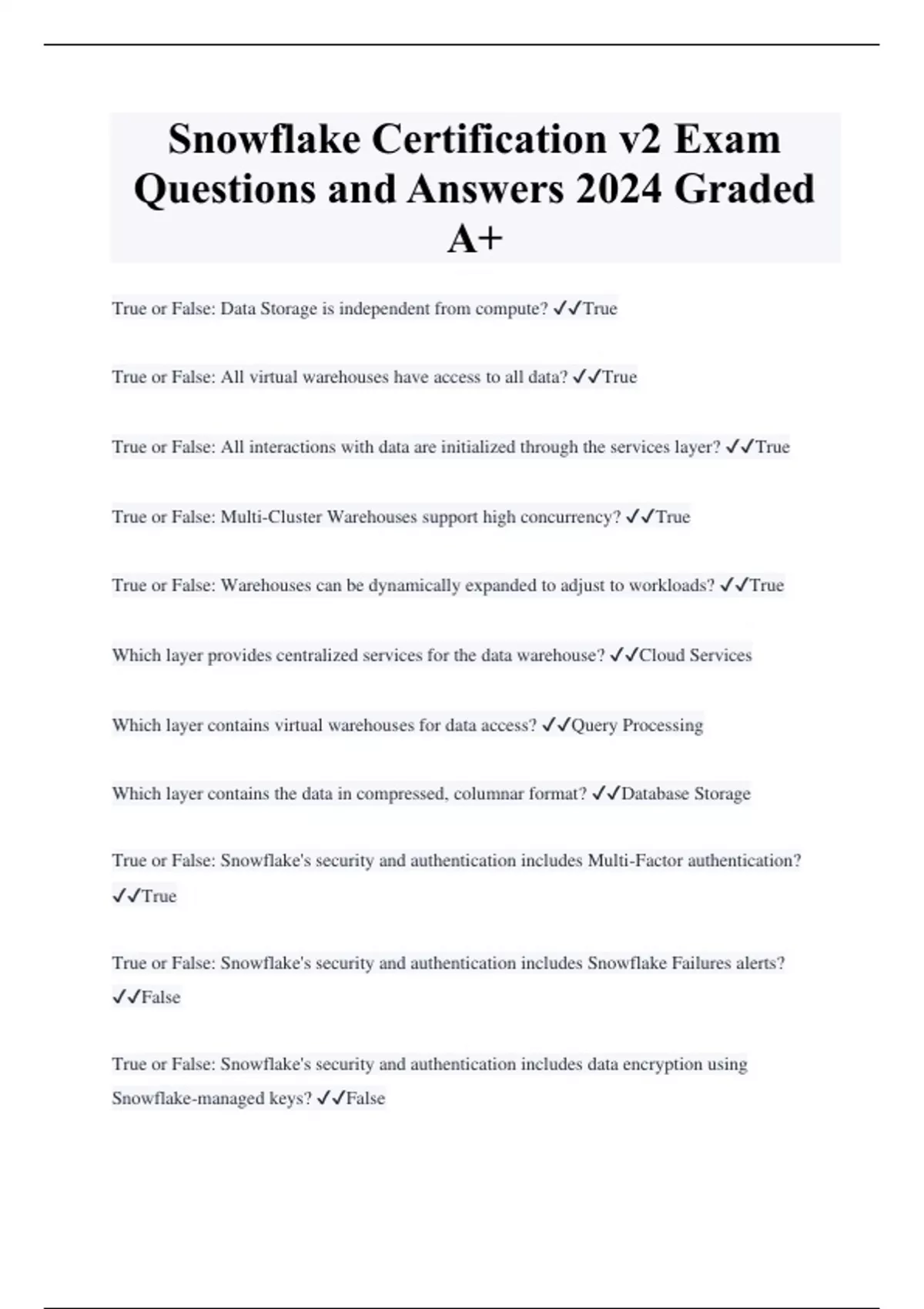 Snowflake Certification v2 Exam Questions and Answers 2024 Graded A+ True or False: Data Storage is independent from compute? True True or False: All virtual warehouses have access to all data? True True or False: All interactions with data are initialized through the services layer? True True or False: Multi-Cluster Warehouses support high concurrency? True True or False: Warehouses can be dynamically expanded to adjust to workloads? True Which layer provides centralized services for the data warehouse? Cloud Services Which layer contains virtual warehouses for data access? Query Processing Which layer contains the data in compressed, columnar format? Database Storage True or False: Snowflake's security and authentication includes Multi-Factor authentication? True True or False: Snowflake's security and authentication includes Snowflake Failures alerts? False True or False: Snowflake's security and authentication includes data encryption using Snowflake-managed keys? False